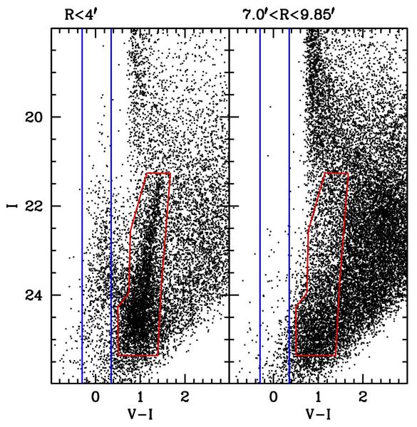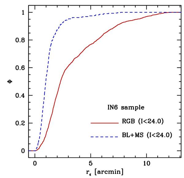 Upper panel: selection boxes for BL+MS stars and RGB stars are superimposed to CMDs representative of the Sgr dIrr galaxy (left panel) and of the fore/background contaminating field (right panel), from the MOSAIC sample. The colour range adopted to select BL+MS stars is −0.30 <V − I< 0.35. Note that the field CMD samples an area that is exactly three time of that sampled by the on target CMD. Lower panel: cumulative radial distribution of the BL+MS (dashed blue line) and RGB (continuous red line) populations in the same range of magnitude.