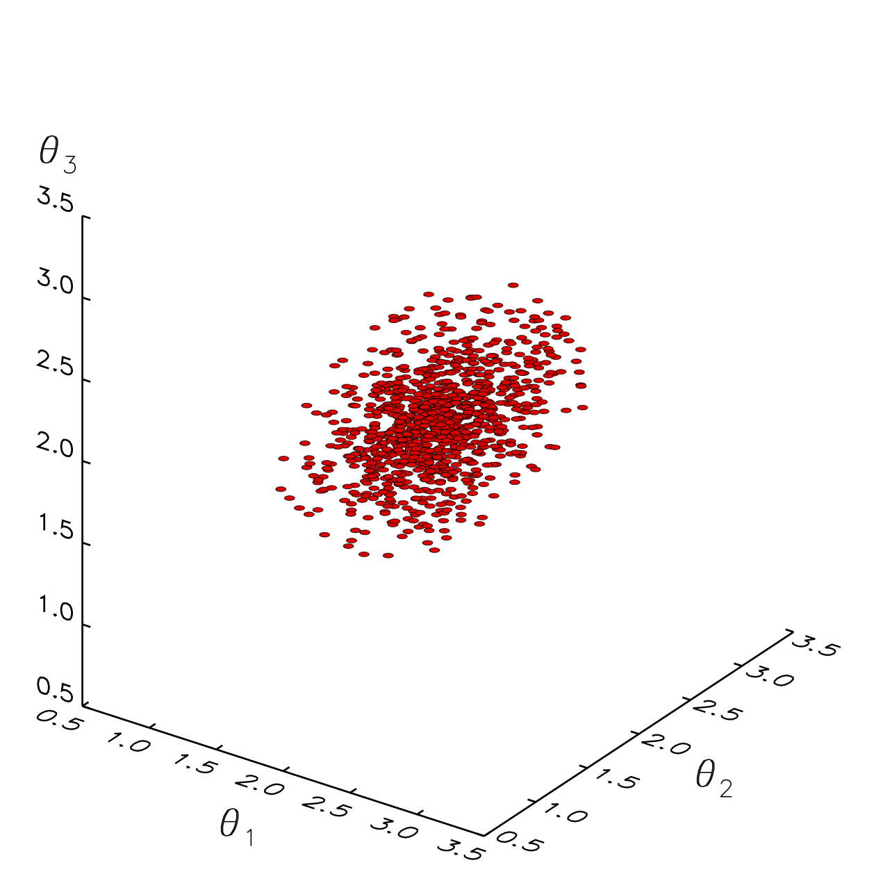 Examples of 1000 points (red dots) drawn according to different prior distributions from a three-dimensional ellipsoid centered at coordinate (2.0,2.0,2.0) in the parameter space defined by θ1,θ2,θ3 ∈ [0.5,3.5]. Left panel: case of a uniform prior along each coordinate,