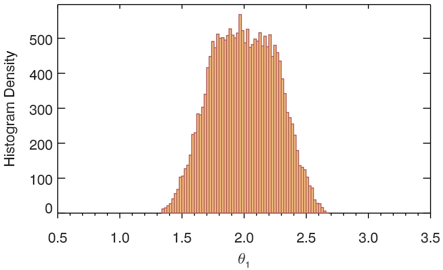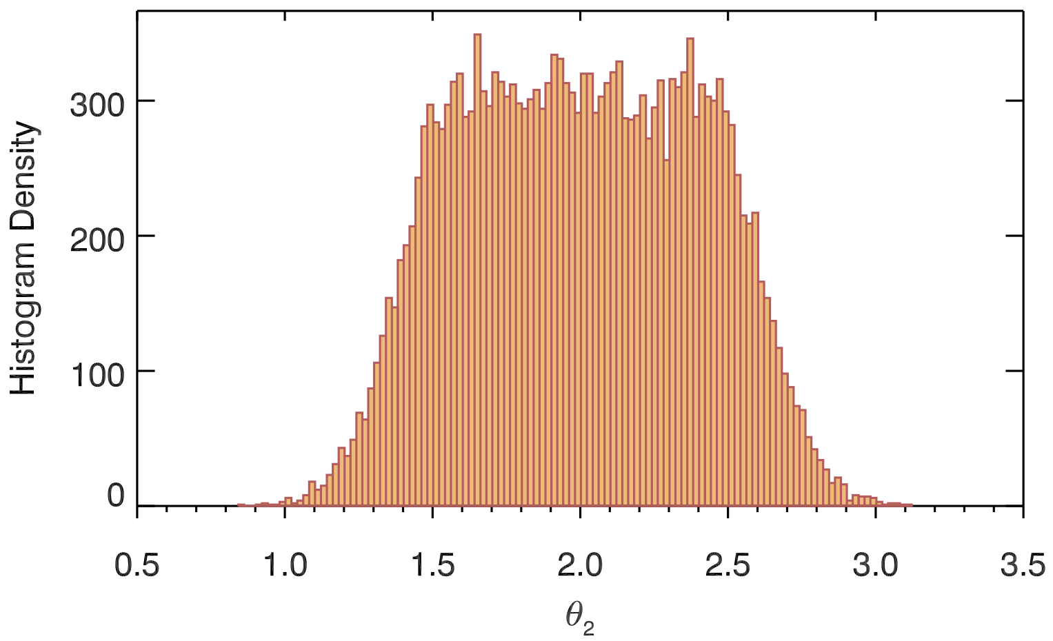 . Panels from left to right show the histogram densities of the number of drawn points per dimension. By definition, the histogram corresponding to the coordinate θ2 has a plateau with twice the width of the plateau of the other two coordinates, while we see the same spread in the tails of the histograms for θ1 and θ2 and a smaller one for that of θ3. All the distributions are also centered in the given input center position.