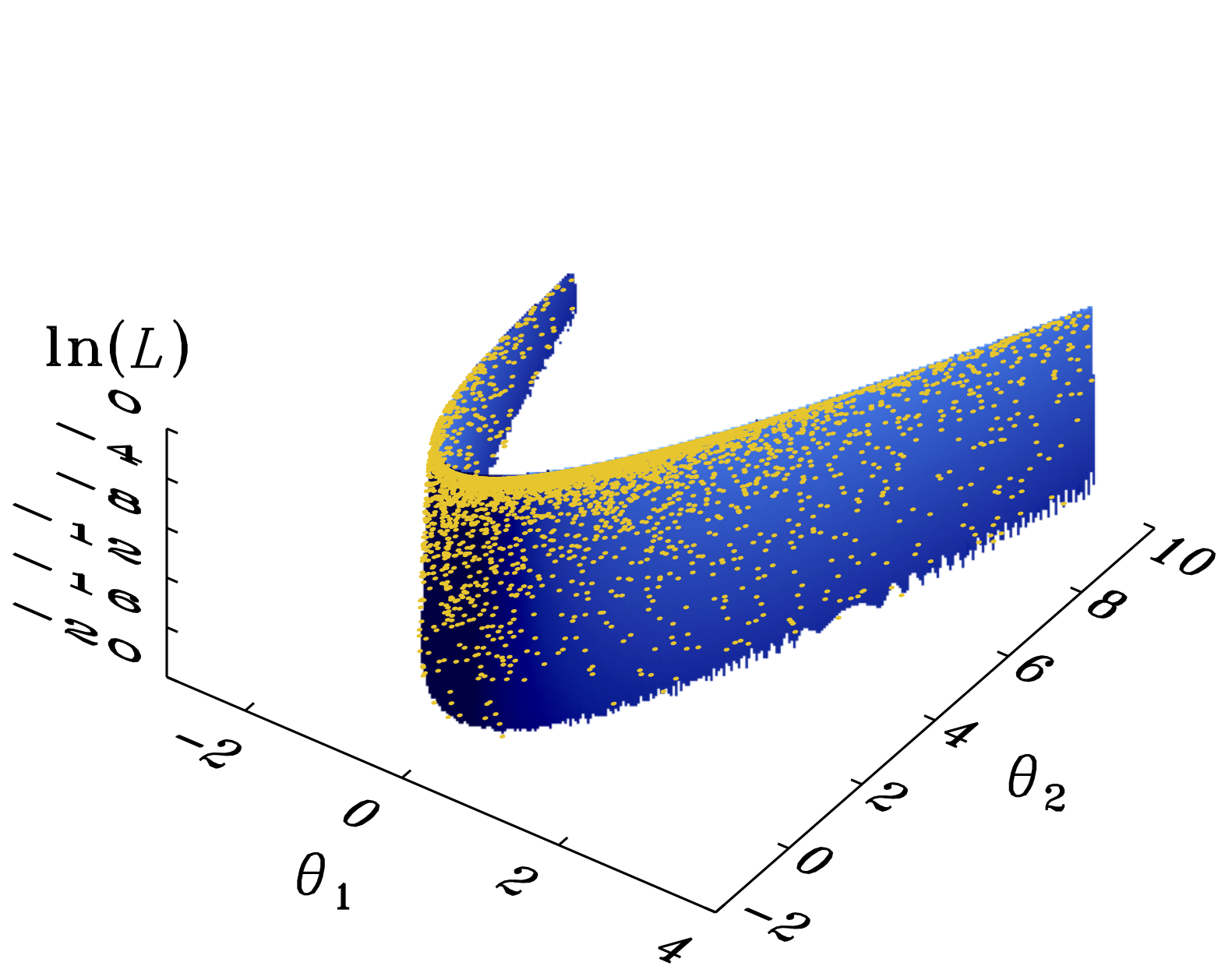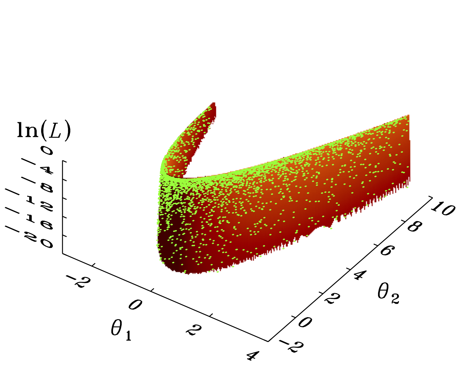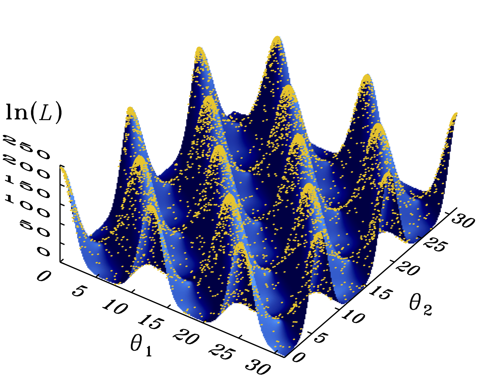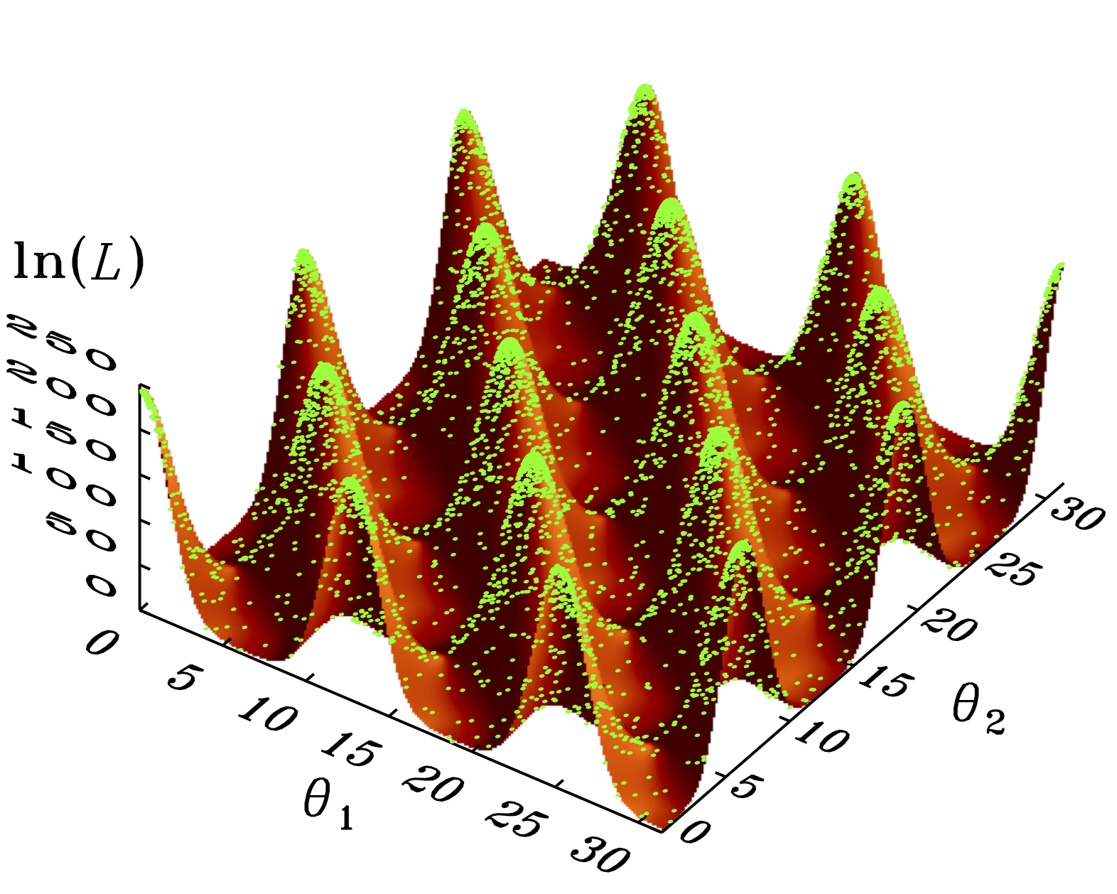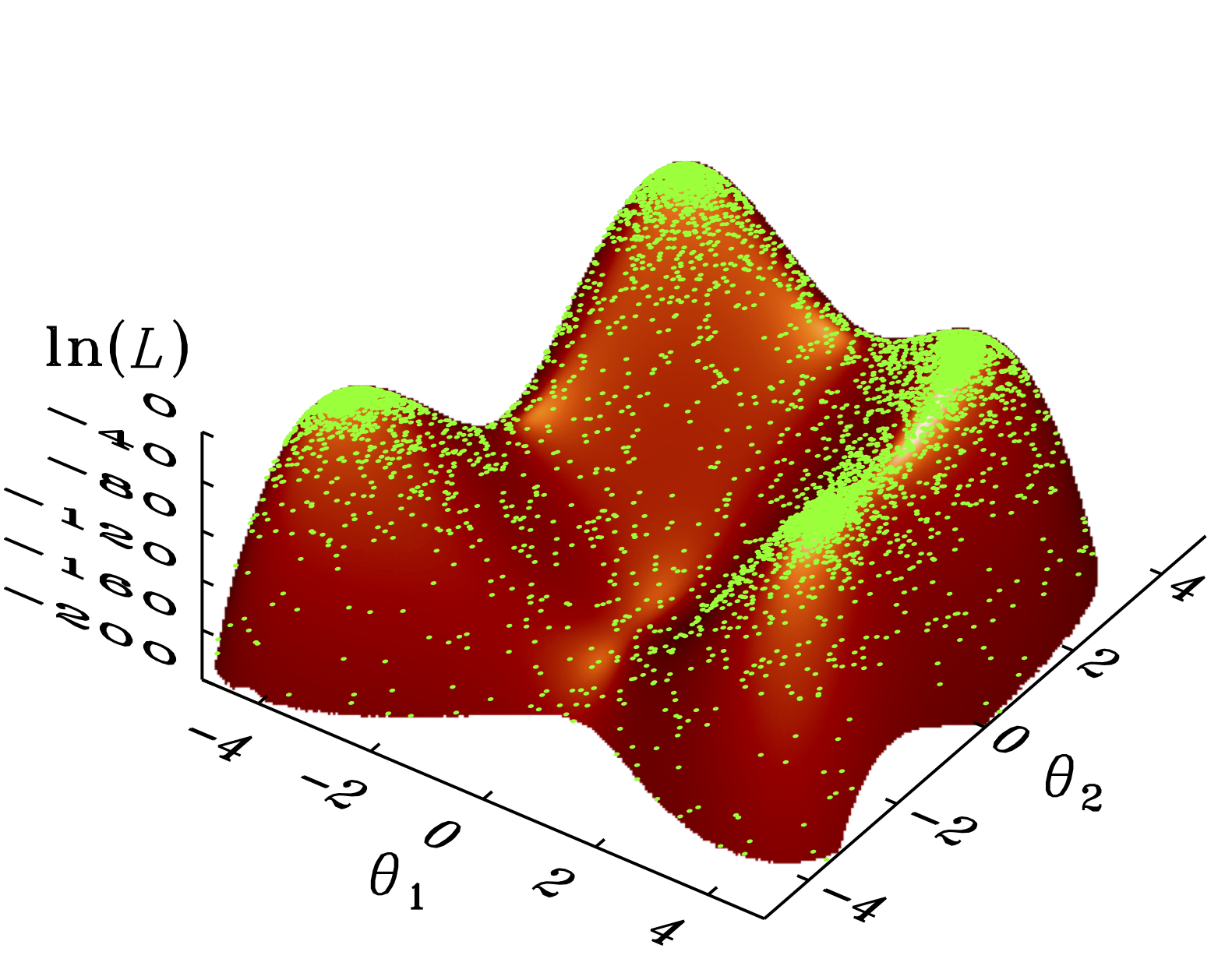 Shaded surfaces show Himmelblau’s function in the range θ1,θ2 ∈ [−5,5] (left), Rosenbrock’s function in the range θ1 ∈ [−3,4] and θ2 ∈ [−2,10] (middle left), Eggbox function in the range θ1,θ2 ∈ [0,10π] (middle right) and Rastrigin’s function in the range θ1,θ2 ∈ [−5.12,5.12] (right). Uniform priors over each coordinate were used for all the demos with stopping thresholds δfinal = 0.05,0.05,0.5, and 0.05, respectively. Upper panels: yellow dots represent (from left to right) the resulting Nnest = 8485, 8558, 8207, 10648 samples obtained with the code presented in Sect. 4 by using Nlive = 1000 points for each demo, as presented by FS13. Lower panels: green dots represent (from left to right) the resulting Nnest = 5286,5151,5874,6174 samples derived by additionally applying the reduction law given by Eq. (17) with tol = 100, γ = 0.4, N0 = 1000 and Nmin = 400 live points.