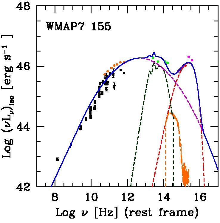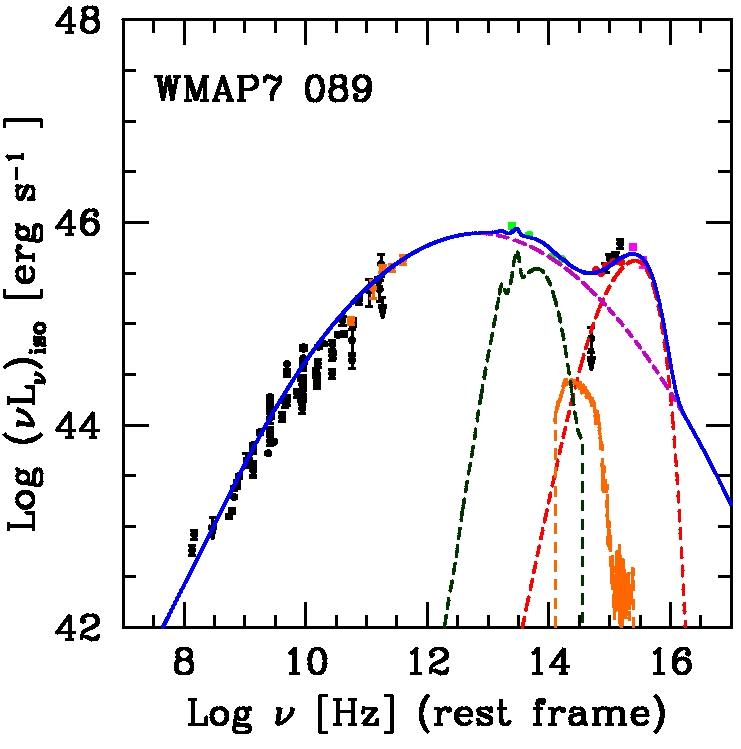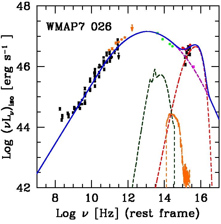 Examples of FSRQ SEDs with no evidence of torus. The same color code as in Fig. 1 is adopted. The dashed dark green lines show the upper limits to the torus component determined with the procedure described in the text.