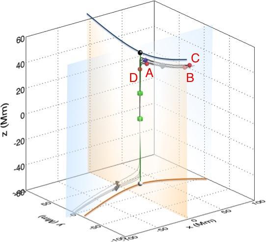 Electron dynamics as a function of time (KEini = 2 eV, θini = 45°). a) The trajectories of four particles in the global separator field, with orbs indicating the starting position (green), final position (red) and any locations where the particles mirror (blue trapezoids); the (thick black) trajectories are overlaid onto local magnetic field lines (grey), with arrows indicating the field orientation. To add context, we also include the nulls and their associated fans and spines, coloured for direct comparison with Fig. 1. b) The change in kinetic energy (black) and parallel electric field (red) experienced by each particle. c) A comparison of the (self-normalised) parallel velocity (black) and magnetic field (blue). The initial positions studied here are recorded in Table 1.