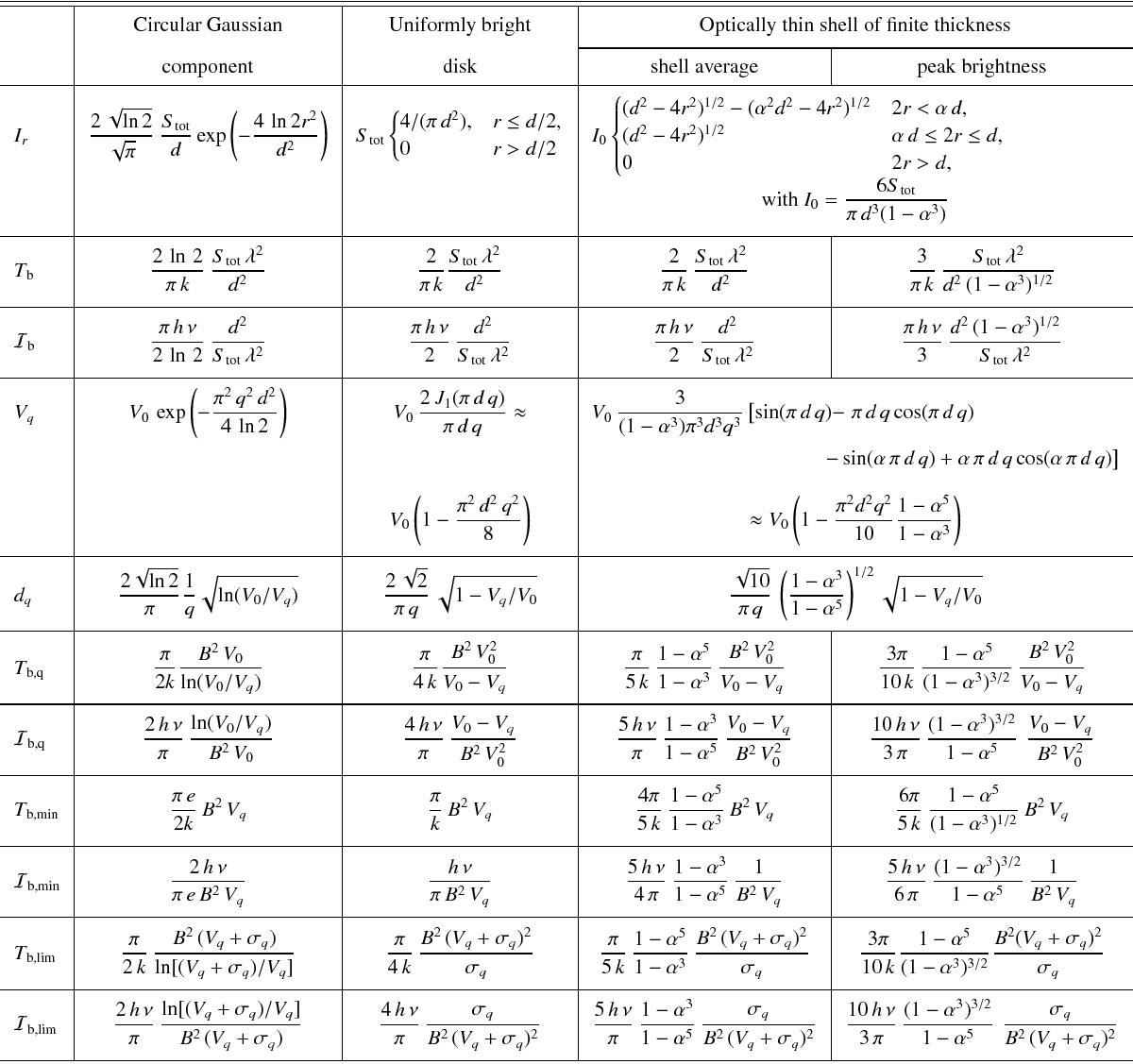 Notes. Ir – brightness distribution function; Tb – brightness temperature estimated from Ir; Vq – visibility function; dq – pattern size, estimated from the visibility ratio Vq/V0; Tb,q – brightness temperature corresponding to dq; Tb,min – minimum brightness temperature, obtained with V0 = eVq for the Gaussian component and V0 = 2 Vq for the disk and the shell; Tb,lim – limiting brightness temperature, obtained with V0 = Vq + σq. For the brightness temperature estimates, the respective ℐ expression give the ℐb term in the Planck form of the brightness temperature equation.