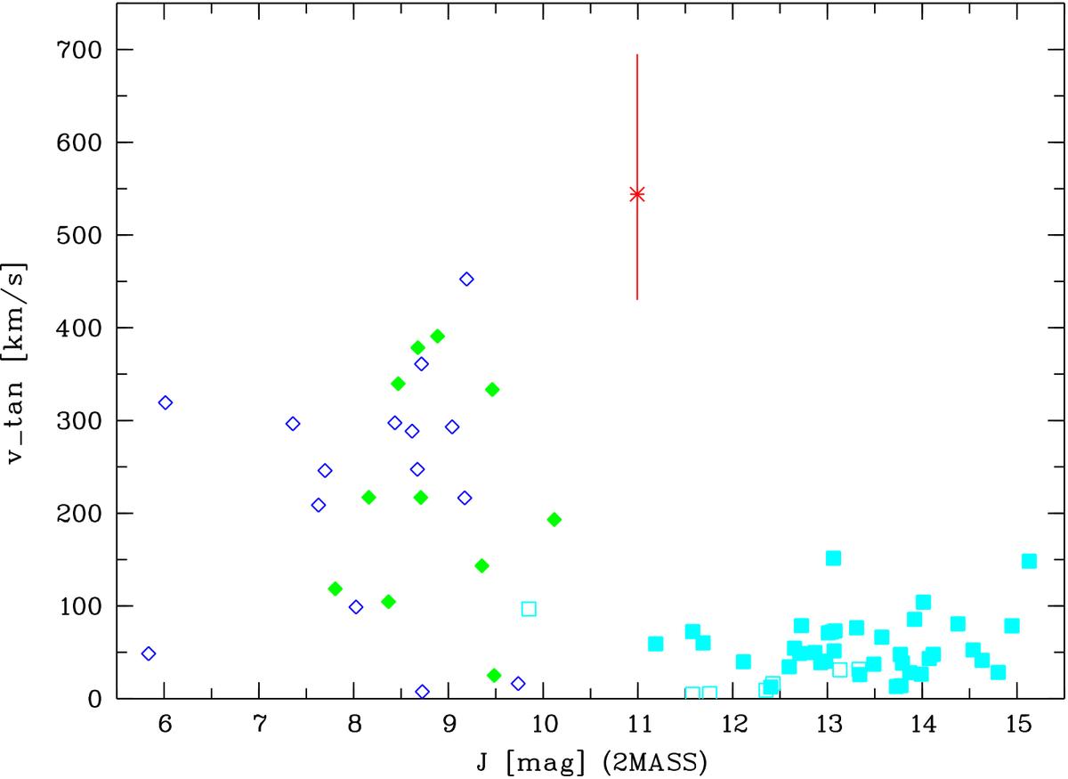 Top: proper motion as a function of J magnitude for WISE J0725−2351, nearby WDs, and sdF/sdG subdwarfs. Bottom: tangential velocities based on the photometric distance estimate for WISE J0725−2351 (Sect. 7) and the trigonometric parallaxes of all other objects (same objects and symbols as in Fig. 1). For clarity, the error bars are shown for WISE J0725−2351 only. The error bars of sdF/sdG subdwarfs may be even larger in cases of uncertain parallaxes, whereas for WDs they are typically comparable to the symbol size.