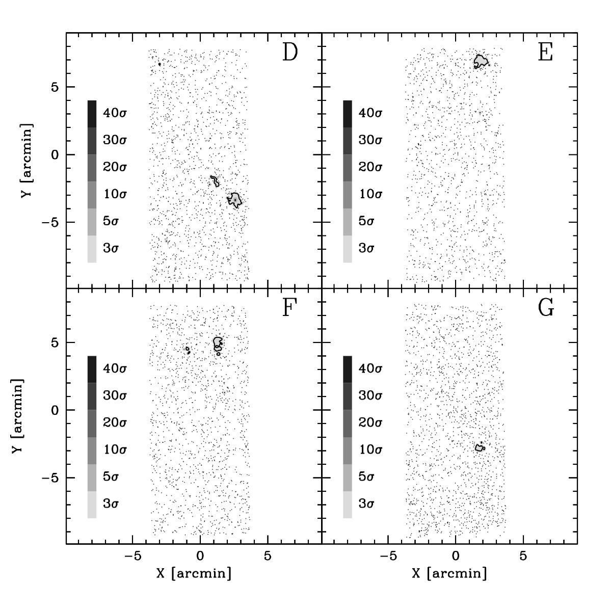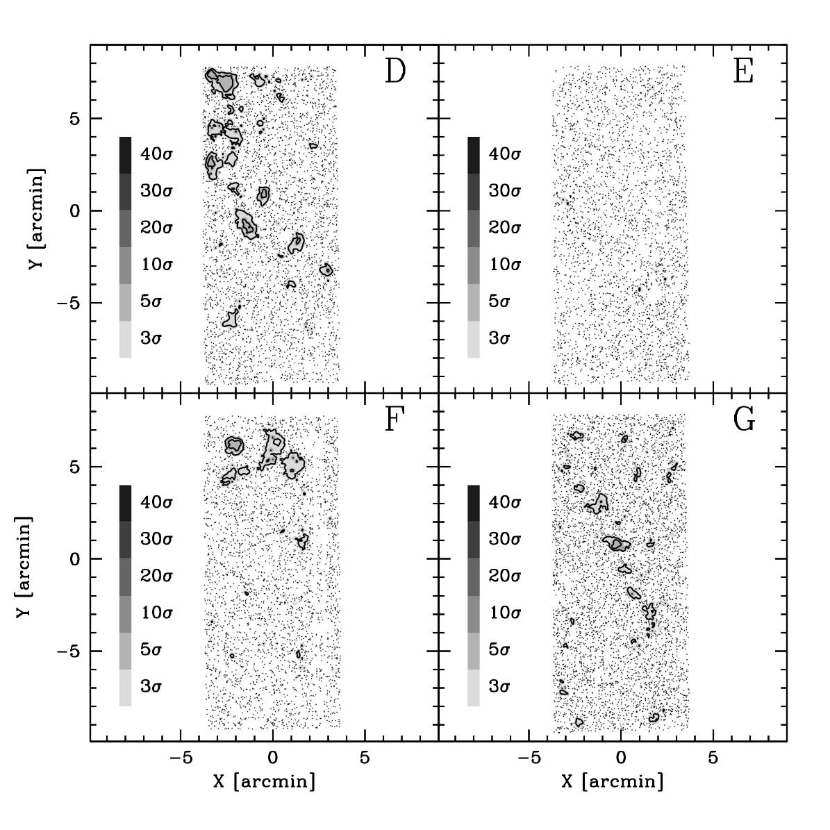 r27 maps and r25 maps for fields D, E, F, and G. The arrangement and the meaning of the symbols are the same as in Fig. 9.