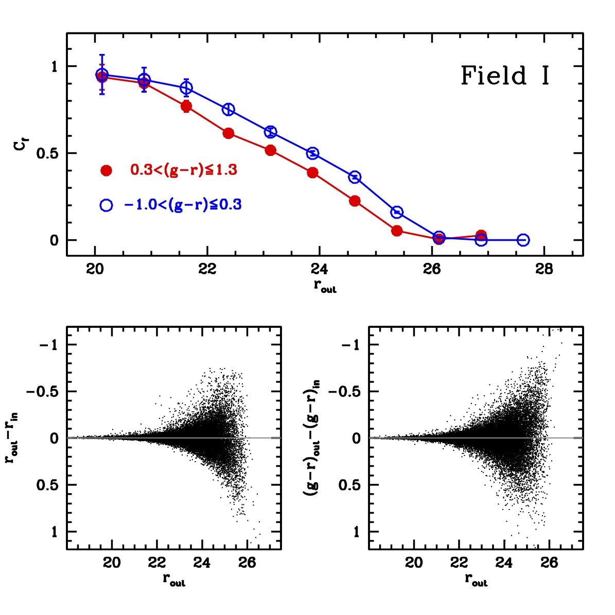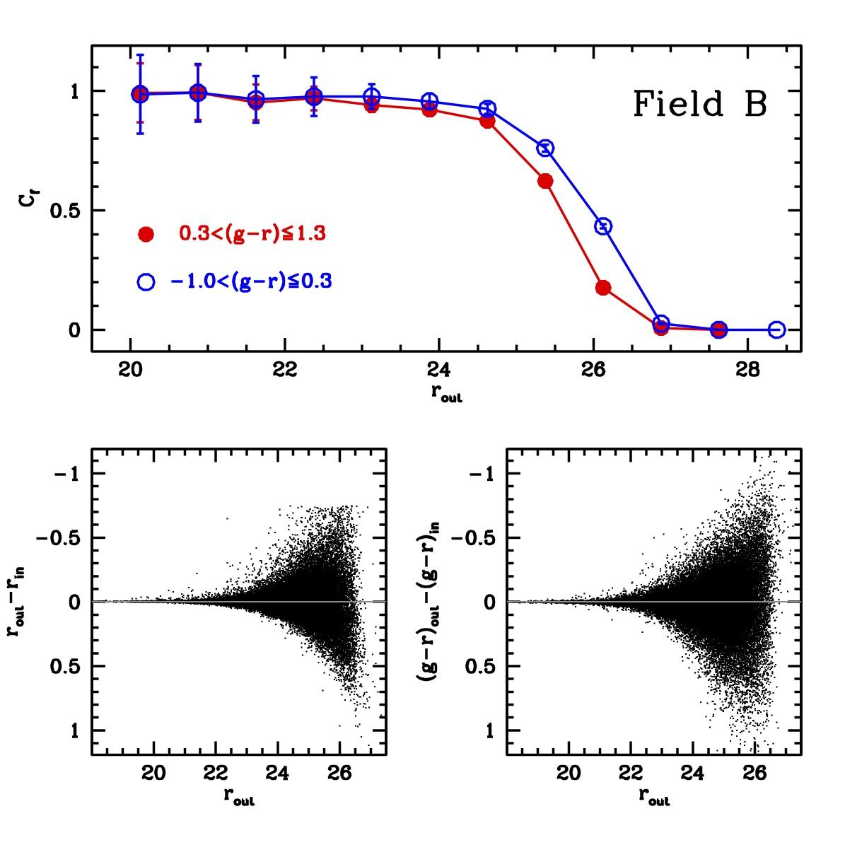 Results of artificial stars experiments for Field B (upper set of panels), and for Field I (lower set of panels). The completeness factor (Cf) as a function of r magnitude is shown for two different colour ranges. Field B is taken as representative of the fields observed under the best conditions; Field I is representative of the worst observing conditions.