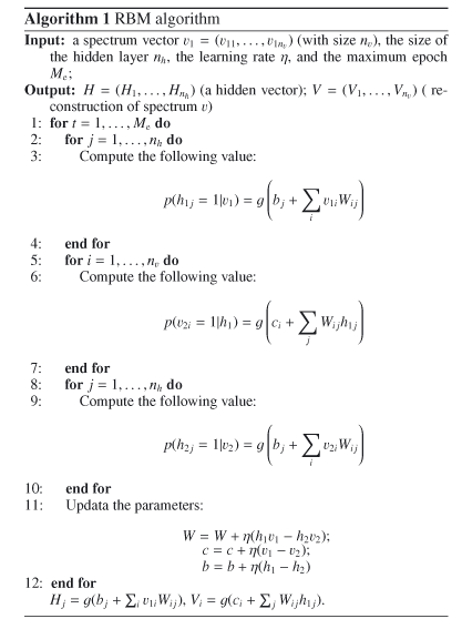 (3)Through Eq. (2), once we know the weight matrix W = (Wij) (i = 1,...,nv,j = 1,...,nh) and the hidden bias aj (j = 1,...,nh), we can get the values of hidden units from the visible units. Through Eq. (3), if we also know visible bias bi(i = 1,...,nv), we can get the value of visible units from the value of hidden units. Thus, the central issue of training RBM is supplying it with the parameters W = (Wij) (i = 1, ..., nv,j = 1,..., nh), aj(j = 1, ..., nh), and bi (i = 1, ..., nv), i.e. parameter θ. We will show how to train RBM in the following section.
