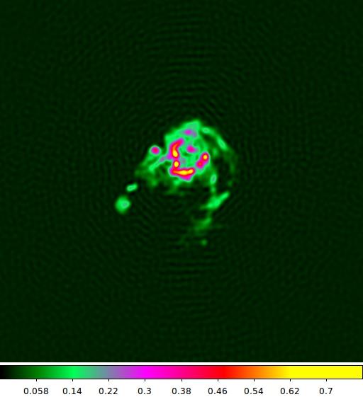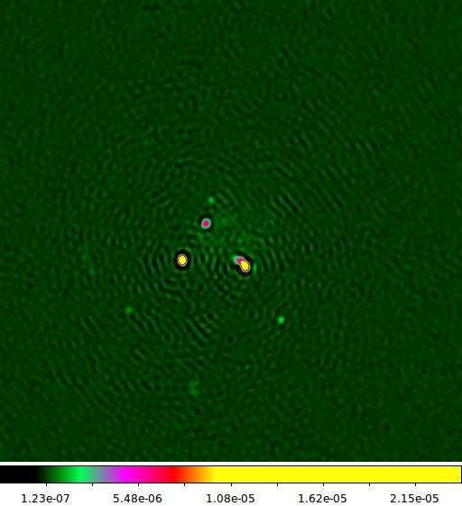 Left: considered uv-coverage; middle and right: dirty images corresponding to the galaxy cluster and M 31, respectively.