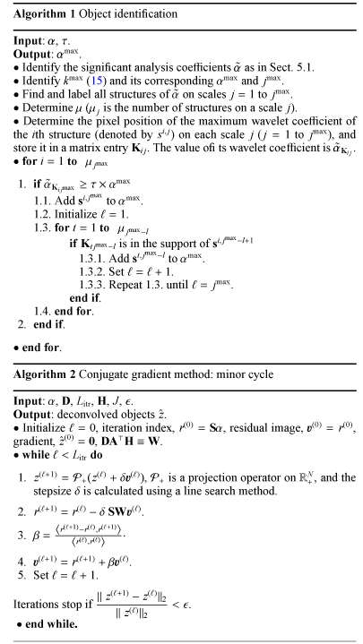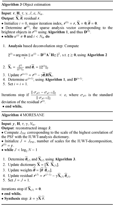 In radio interferometry, each recent reconstruction algorithm has its own sparse representation model. Explicit sparse priors were indeed first expressed in the direct image space, which is typically appropriate for (but limited to) fields of unresolved stars 39; 40. In this case, the restored image can be obtained by solving the BPDN problem associated to (10)with S = I (or to (11)with A = I). This is also the approach of Wenger et al. .