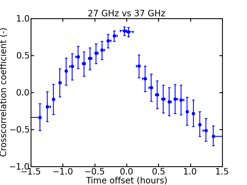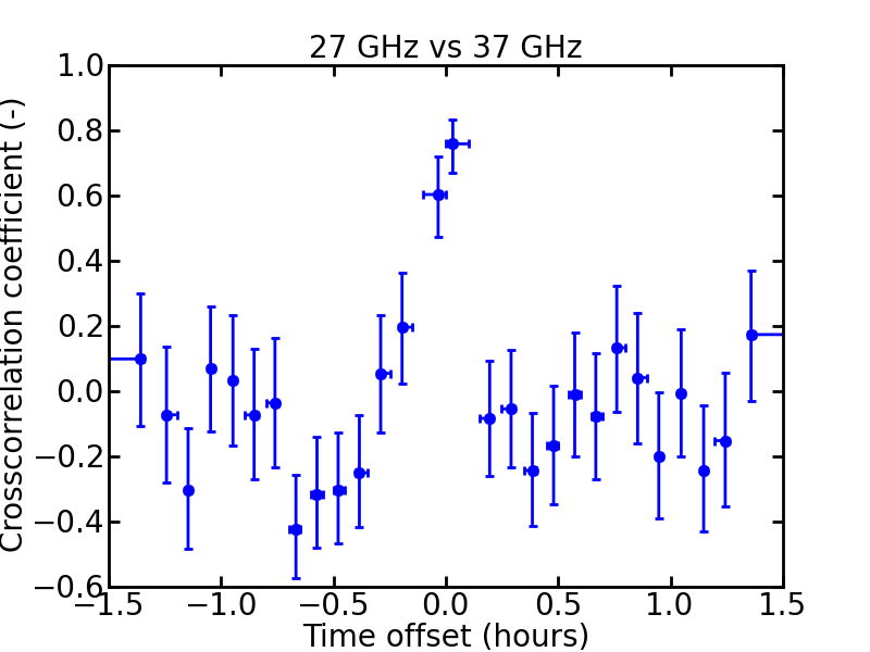 Example of a cross-correlation curve for the original light-curve data (left) and for the light-curve data with the FRED trend subtracted (right). The skew in the CCF for the full light curves suggests a nonzero timelag, but the zero-lag peak is too prominent to provide any useful estimate. After the fitted FRED trend is subtracted from both light curves and the cross-correlation is performed again, the only prominent cross-correlation peak corresponds to zero time lag.