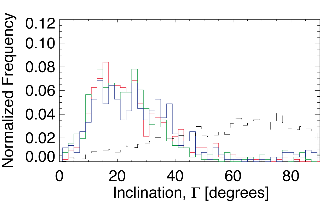 Left: histograms of Γ found in plage around −220X, −170Y. The three coloured histograms were obtained using core pixels, where red refers to log (τ) = 0, green shows to log (τ) = −0.9 and blue refers to log (τ) = −2.3. The dashed histogram represents Γ of canopy pixels at log (τ) = −2.3. Right: histograms of Φ found in plages around −220X, −170Y. The three colours and the dashed line have the same significance as in the graph on the left in this figure. The dotted line represents a homogeneous distribution.