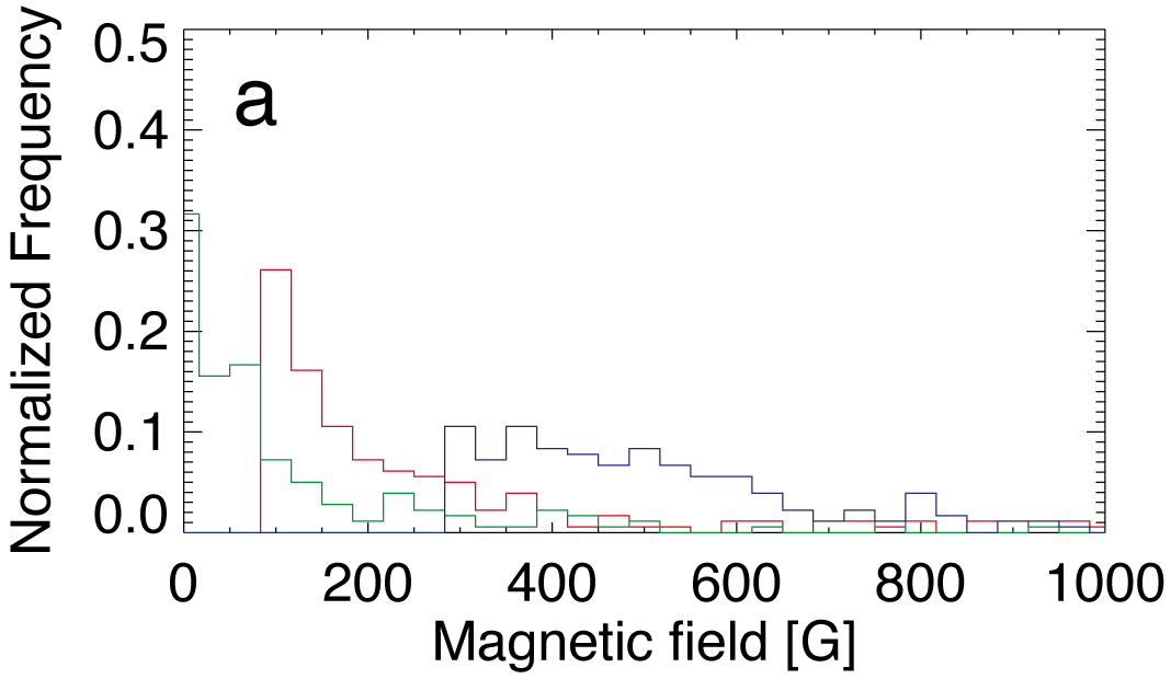 a) Histograms of the magnetic field strengths in pixels featuring weak opposite polarities. The colours red, green, blue refer to log (τ) = 0, − 0.9 and −2.3, respectively. b) Histograms of the LOS velocities in the same pixels. The colour code is identical.
