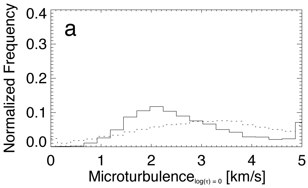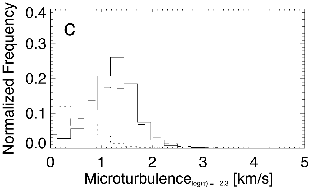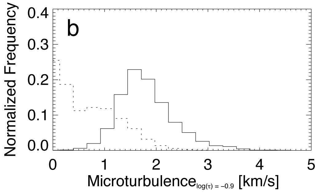 Histograms of microturbulent velocities in core pixels, solid and the quiet Sun, dotted, at log (τ) = 0, a), at log (τ) = −0.9, b), and at log (τ) = −2.3, c). The dashed histogram in panel c), at log (τ) = −2.3, represents the microturbulent velocities of canopy pixels.