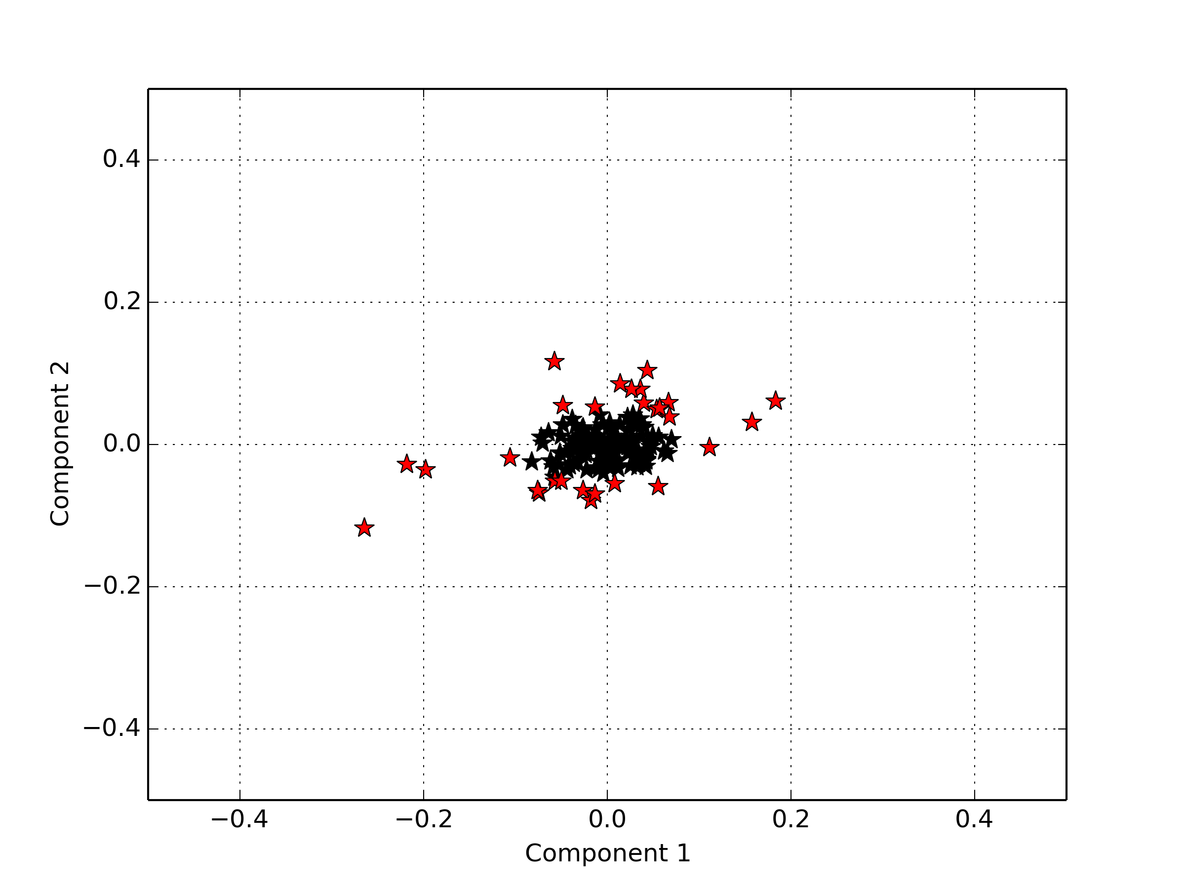 Dwarf (left) and giant stars (right) from all clusters represented using the first two components of the PCA with the central cluster location subtracted. Stars chemically identified as outliers are shown in red.
