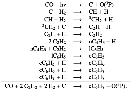 For T500, there are differences between the two chemical schemes, both for the solar C/O ratio and for the carbon-rich case. In both cases, important carbon species such as CO and C2H2 are destroyed in the upper atmosphere by photolysis. With the C0-C6 scheme, these species are destroyed to a larger extent than with the C0-C2 scheme, and we found that the “missing” carbon is placed in cC6H8 through the following chemical pathway, starting with the photodissociation of CO: