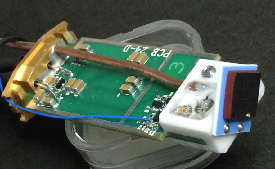 Top: one CZT detector (10 mm × 10 mm × 2 mm) and its associated electronics board with preamp, LNA and shaper. The actual components of the LNA are on the opposite side of the board to avoid electrical interference. The thick wire is the high-voltage supply to the detector (the blue wire is a test lead). Bottom: a computer rendering of an exploded view of the detector system. The upper plate is a structural Al frame in which a 0.016 mm-thick aluminum foil will be stretched to provide light and electrical shielding to the detectors. The bottom brass piece provides structure and casing for the detectors and PCBs.