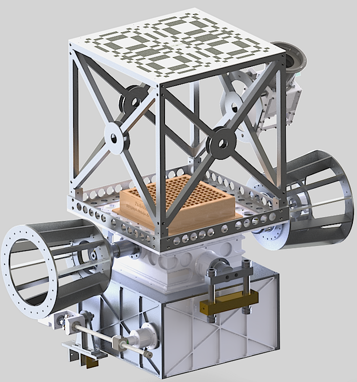 Computer rendering of the protoMIRAX X-ray Camera. Left: exploded diagram of the XRC, showing, from top to bottom, the coded mask, collimator, aluminum foil support plate, detector system, detector electronics and power supply boxes, and battery pack. Right: the assembled XRC with passive shielding and structural parts, including the elevation axis support. Also shown are one of protoMIRAX’s two star cameras (top right) and the elevation driving mechanism (bottom left) based on a ball screw.