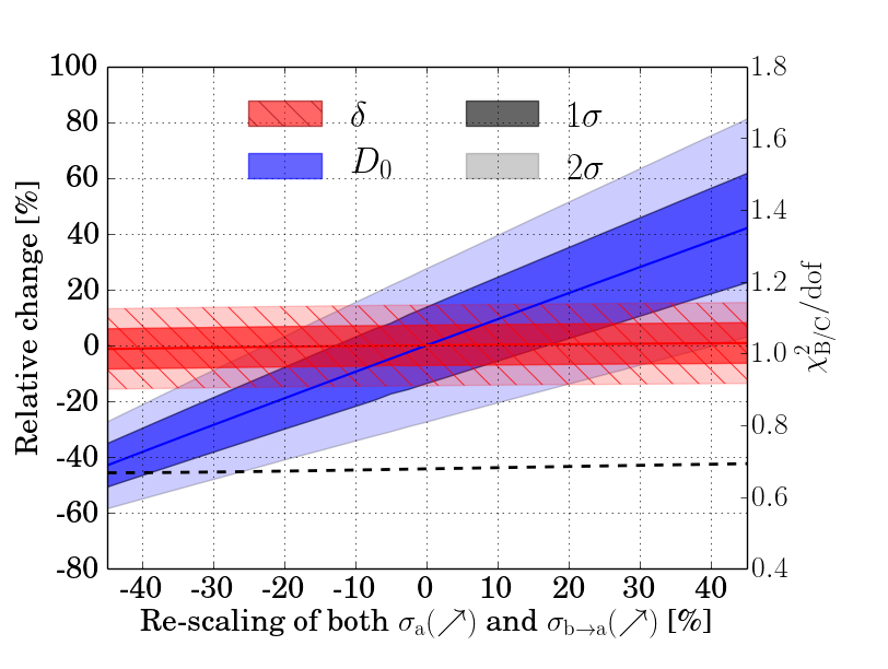 Effect of rescaling nuclear cross-sections for boron production channels and destruction ones: the left panel assumes correlated, the right panel anti-correlated rescaling.