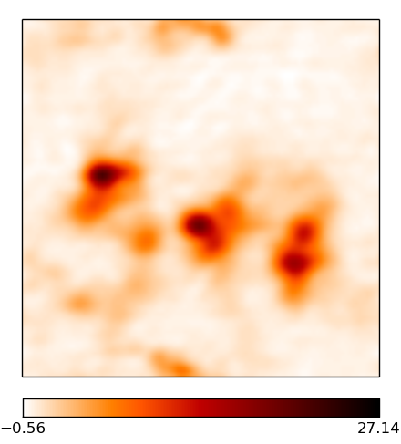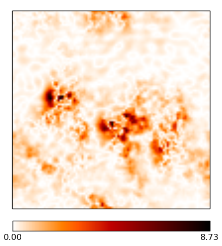 Comparison of multifrequency resolve and MS-MF-CLEAN surface brightness reconstructions. The images are 1002 pixels large, and the pixel size corresponds to roughly 0.2 arcsec. The brightness units are in Jy/px. The ridge-like structures in the difference maps simply stem from taking the absolute value, marking zero-crossings between positive and negative errors. First row left: resolve reconstruction. First row right: MS-MF CLEAN reconstruction. Second row left: absolute per-pixel difference between the signal and the resolve reconstruction Second row right: absolute per-pixel difference between the signal and the MS-MF CLEAN reconstruction.