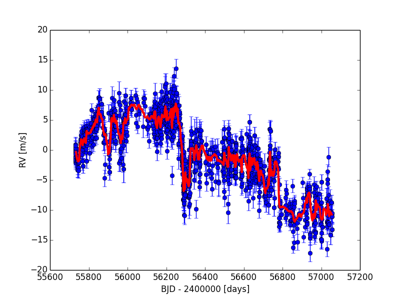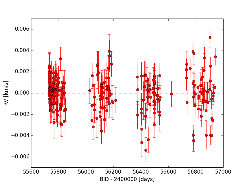 Upper panel: zero-point drift correction (red line) as a function of time and the adjusted RV data set used to create it (blue dots). Bottom panel: RV time series of HD 185144 after the zero-point drift correction. This correction decreases the rms from 5.37 m s-1to 1.61 m s-1.
