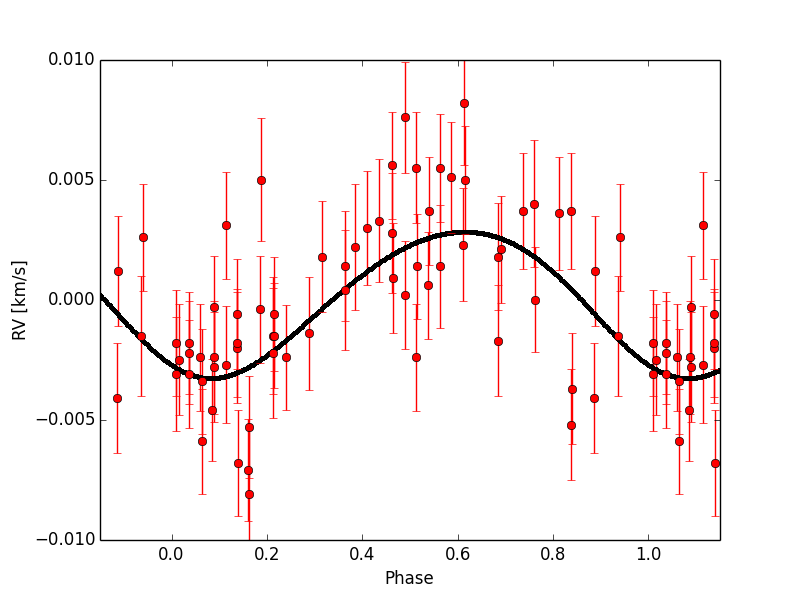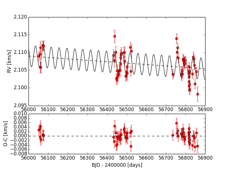 Upper panel: radial velocities of HD 164595 with the best-fit orbital solution (solid line). Error bars include the photon and instrumental noise and the stellar jitter. Bottom panel: phase-folded radial velocities of HD 164595 with the best-fit orbital solution (solid line). Error bars include the photon and instrumental noise and the stellar jitter.