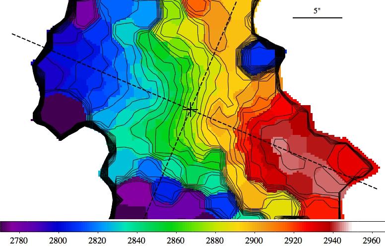 Top left panel: enlarged image of the 2D map of the line-of-sight velocity of stars in the region of the HG. The iso-velocity contours are overlaid on the image, the minimum and maximum values are 2785 km s-1 and 2960 km s-1, with a step of about 6 km s-1. The cross marks the centre of the galaxy where the systemic velocity is V = 2875 ± 3 km s-1. The dashed lines indicate the photometric major and minor axes of the HG. Top right panel: high-frequency residual image obtained by the ratio of the original reduced r-band MUSE image with a smoothed one, where each original pixel value is replaced with the median value in a rectangular window of 25 × 25 pixels. Bottom left panel: enlarged image of the 2D map of the velocity field derived by the model. The dashed line indicates the direction of the HG minor axis PA = 157°. The iso-velocity contours are overlaid on the image, the minimum and maximum values are −145 km s-1 and 145 km s-1, with a step of about 13 km s-1. See Sect. 4 for details. Bottom right panel: enlarged image of the 2D map of the line-of-sight velocity of gas in the regions close to centre of the galaxy. The iso-velocity contours are overlaid on the image, the minimum and maximum values are 2800 km s-1 and 2920 km s-1, with a step of about 6 km s-1. In all images the cross marks the centre of the galaxy and north is up, east on the left.