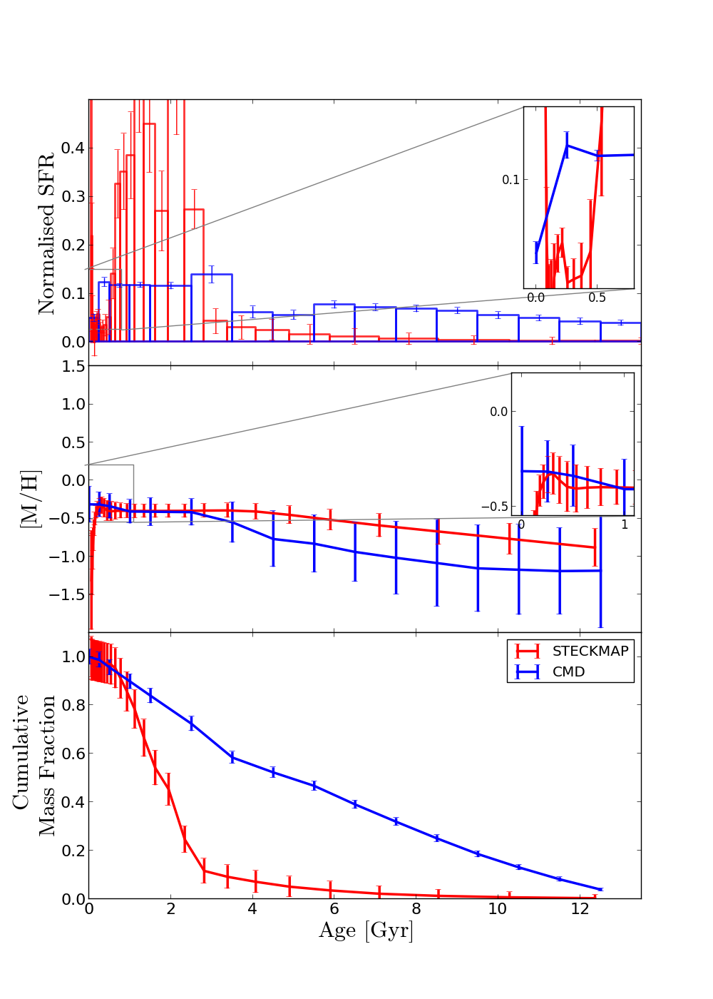 Comparison between the LMC bar SFH from the CMD and the integrated spectrum using STECKMAP. Left: test 7; right: test 8. For further information see Fig. 4.
