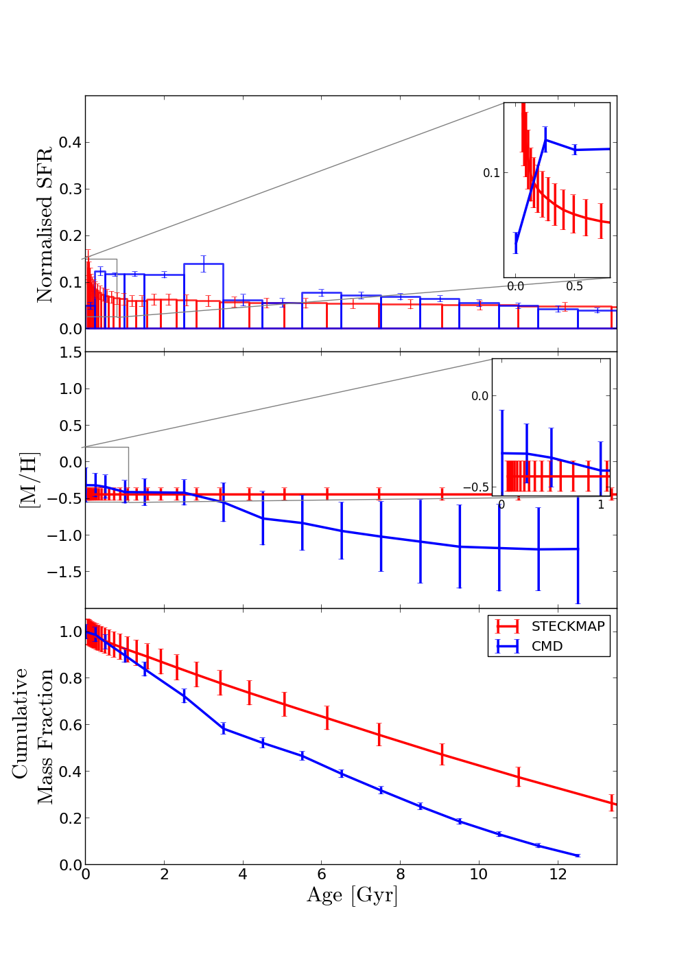 Comparison between the LMC bar SFH from the CMD and the integrated spectrum using STECKMAP. Left: test 13; right: test 14. For further information see Fig. 4.