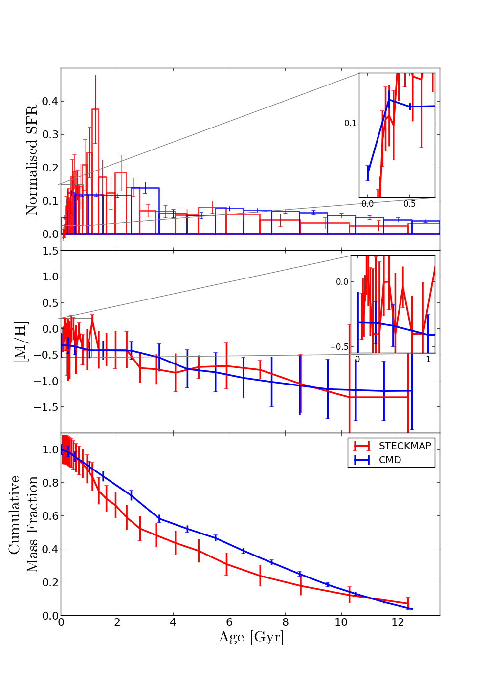 Comparison between the LMC bar SFH from the CMD and the integrated spectrum using STECKMAP. Left: test 19; right: test 20. For further information see Fig. 4.