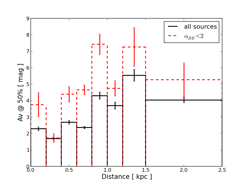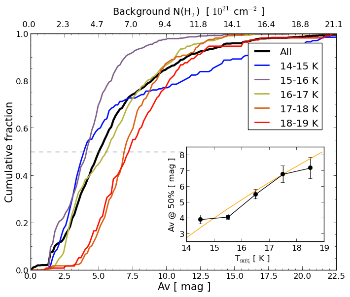 Cumulative fraction of sources as a function of the background visual extinction. The top left frame compares starless (green) and protostellar (orange) sources. Solid lines are for all sources, dashed lines are for cores with αBE< 2. The top right frame shows, for all sources, the number of sources per bin of background column density and the mean fraction of starless (SL, green line) and protostellar (PS, orange line) sources in each bin. The bottom left frame shows the values of visual extinction AV at 50% of cumulative fraction for different bins of distance. Solid black lines are for all sources, red dashed lines for cores with αBE< 2. The bottom right frame shows the cumulative fractions for sources with αBE< 2 obtained per bin of field 9th decile temperatures T90%. The insert shows the variations in visual extinction AV at 50% of cumulative fraction as a function of T90%. The orange solid line shows Eq. (7) for β = 2, α = 4.5, and Tth = 12 K without fitting the data. The error bars in the insert and in the bottom left frame are proportional to 1/, where Nsources is the number of sources in the bin of T90% or distance. It assumes that the uncertainty on the AV estimate of each source is 100%.