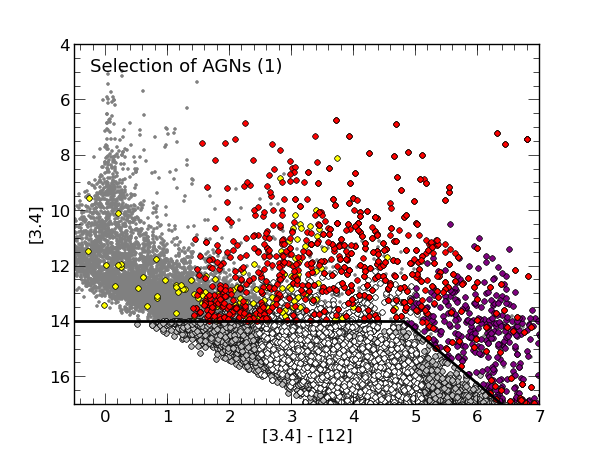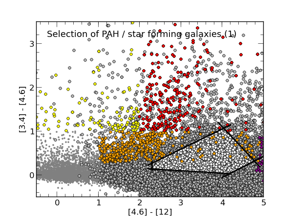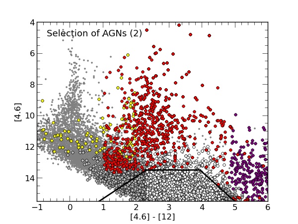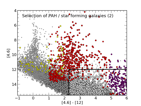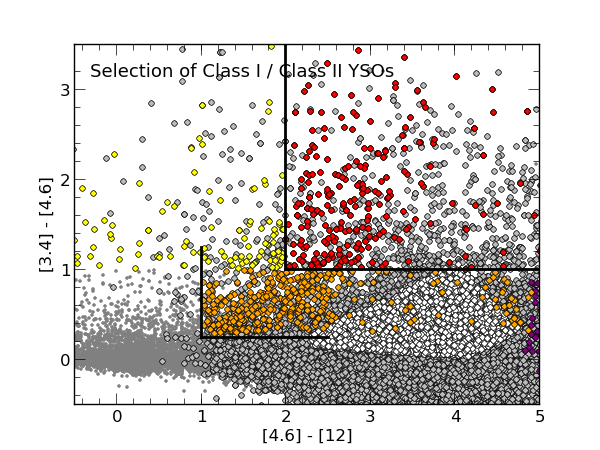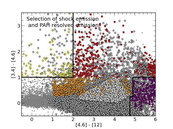 WISE colour−magnitude and colour−colour diagrams for classification of sources, showing the colour−magnitude and colour−colour criteria (black lines), AGN-classified sources (grey points with black edges), PAH/star forming galaxy-classified sources (white), shock-classified sources (yellow), resolved PAH emission-classified sources (purple), Class I-classified sources (red), Class II-classified sources (orange), and unclassified sources (small grey points without edges).