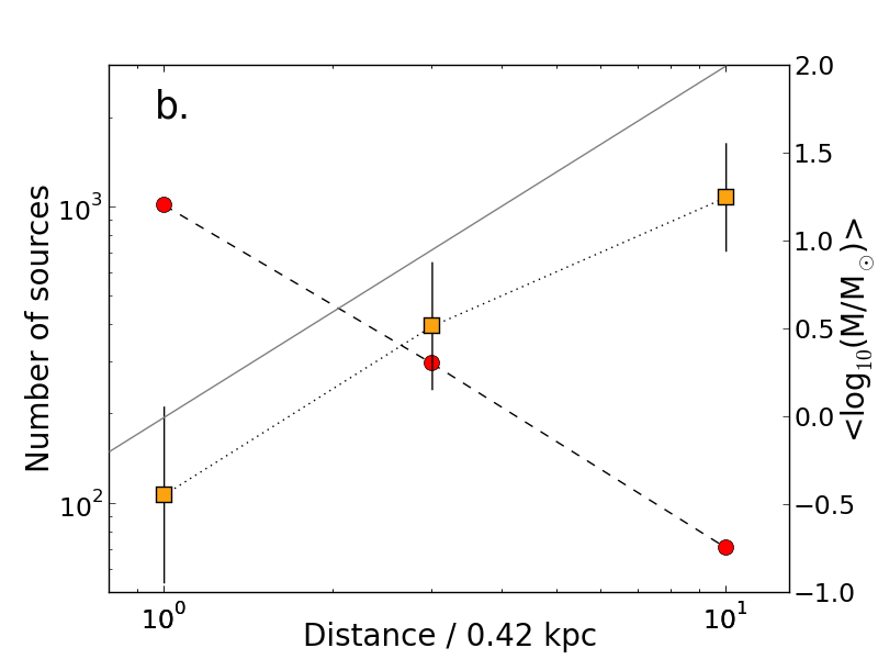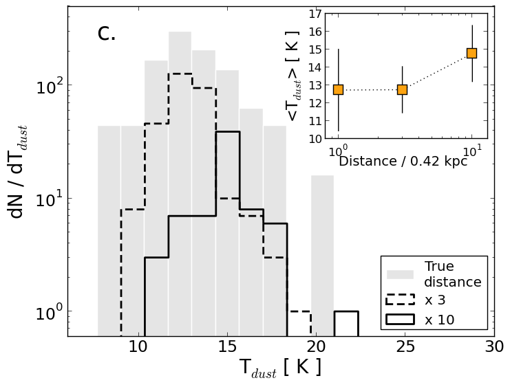 a) Source mass function of the G163.82-8.44 field for several values of the simulated distance. b) Number of sources (red circles) and average of the logarithm of source masses (orange squares) as functions of the simulated distance. The vertical bars show the standard deviation of the logarithm of source masses. The solid grey line shows a power law with exponent 2 on the right y-axis. Dotted and dashed lines are plotted to guide the eye. c) Histogram of dust colour temperature Tdust of G163.82-8.44 sources for several values of the simulated distance. In the inset, orange squares show the average values of Tdust and the vertical bars show the standard deviation of Tdust as functions of the simulated distance.