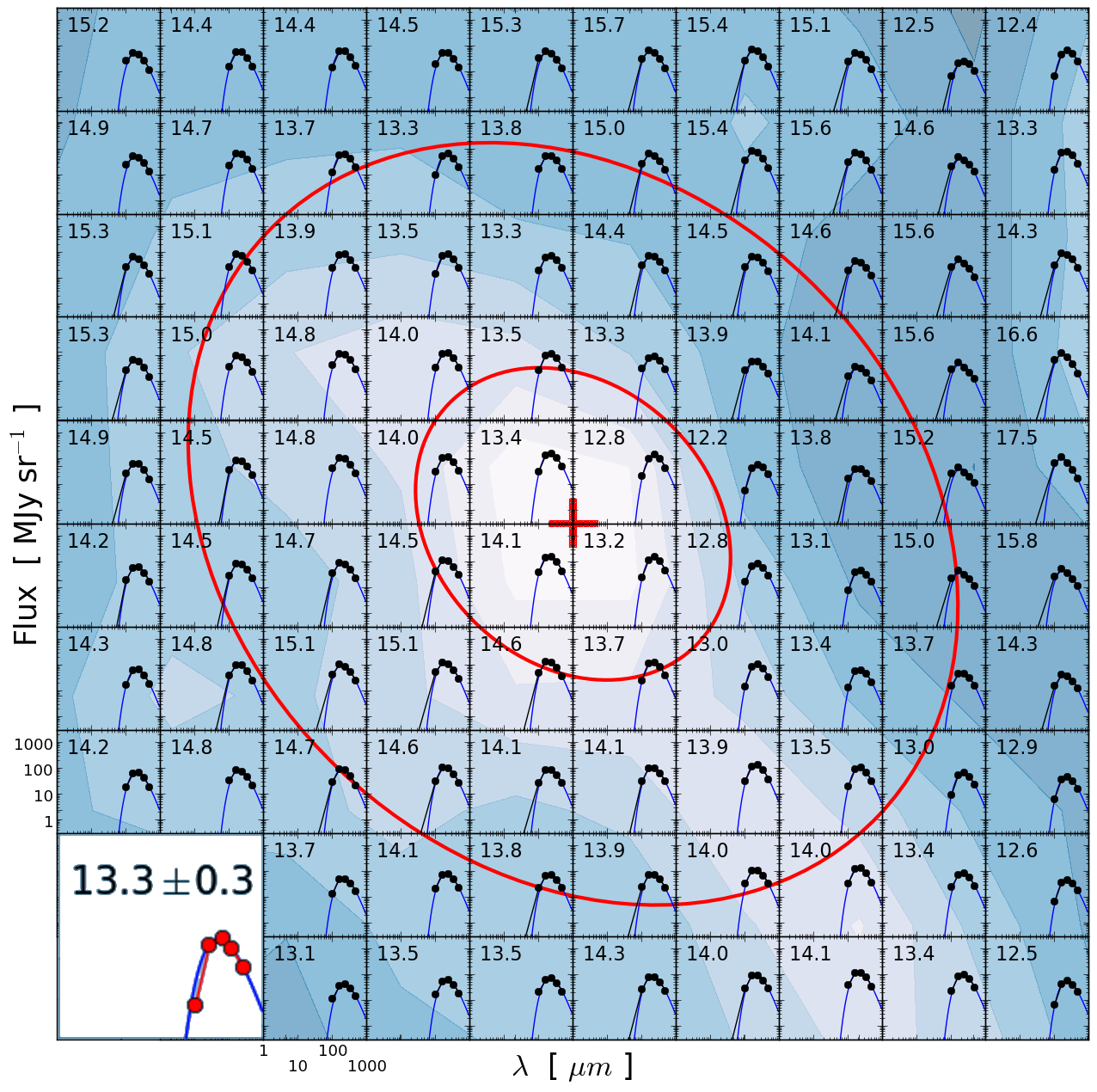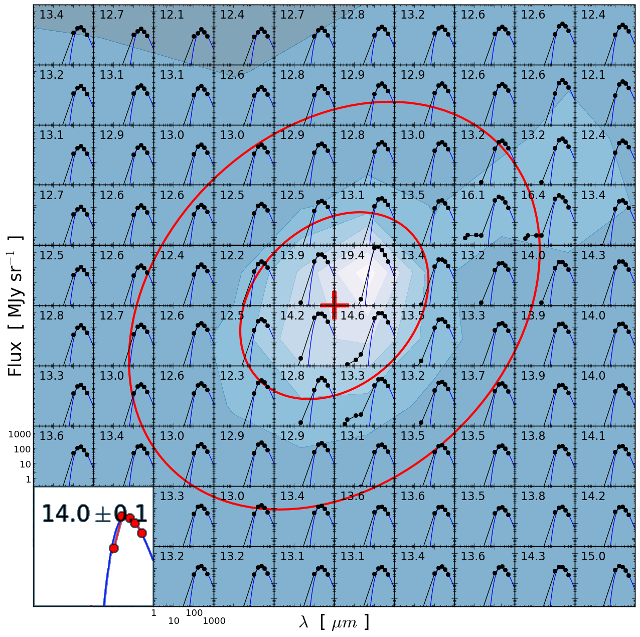 Pixel-by-pixel spectral energy distributions of a starless cold core (left; source ID = 1466, α = 100.32654, δ = 10.42901, in G202.02+2.85) and a cold core hosting a known young stellar object (right; source ID = 3863, α = 343.42069, δ = 62.533048, in G109.80+2.70 = PCC288). Each pixel is 20′′. Shown are the fluxes at 100 and 160 μm from PACS and 250, 350, and 500 μm from SPIRE. The fluxes at 3.4, 4.6, 12, and 22 μm from WISE are also shown, but are high enough to be visible only near the protostar in the right panel. The blue lines are the best fit of the four longest wavelengths using a modified black body with a fixed spectral index β = 2. The corresponding colour temperature is indicated in the top left corner of each pixel, in units of kelvin. The backgrounds are filled contour maps of the 250 μm surface brightness. The large and small red ellipses are the FWHM and footprint of the sources, respectively, as given by getsources for the column density map. The red cross shows the centre position of the source. In the bottom left corners, red points show the SED derived from getsources total fluxes of the sources for 160 μm from PACS and 250, 350, and 500 μm from SPIRE.