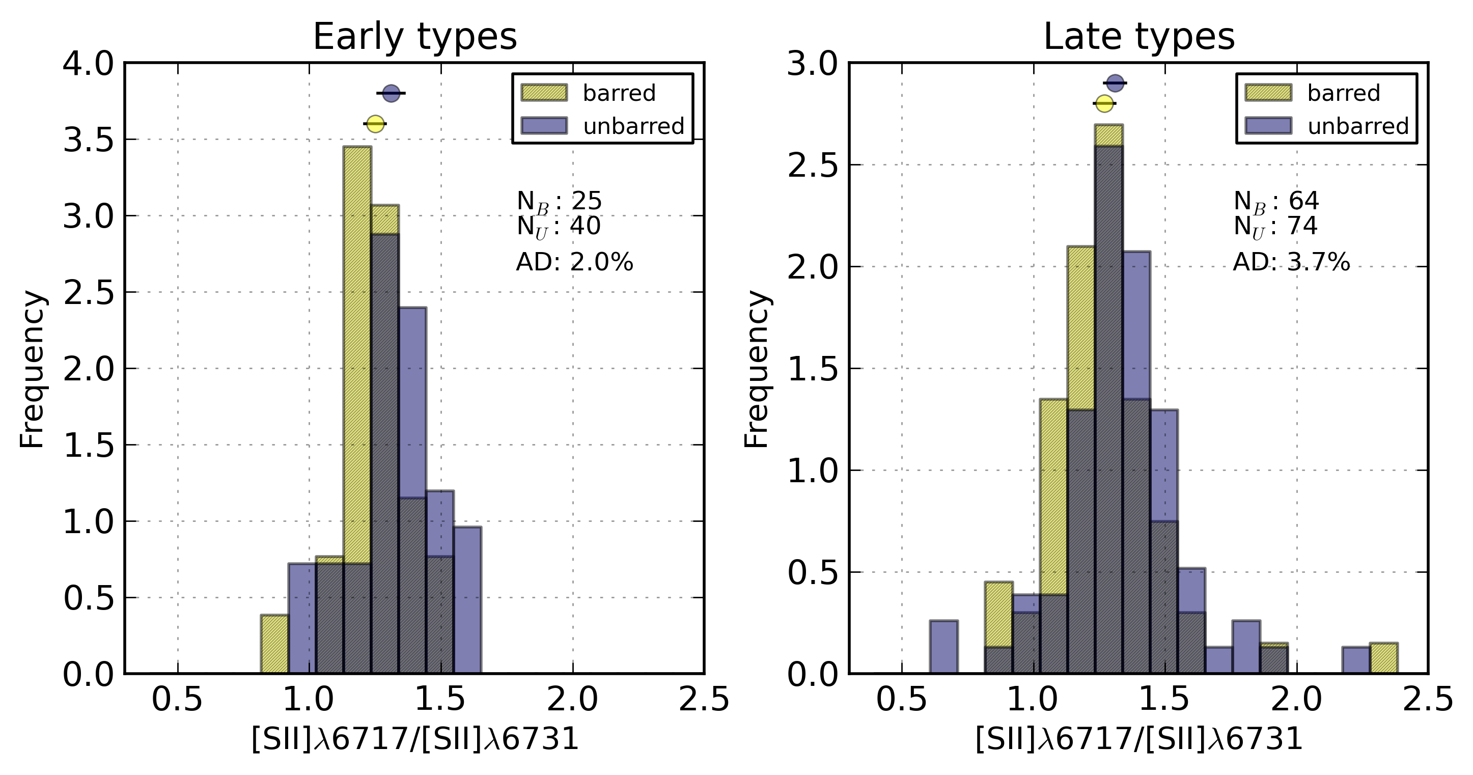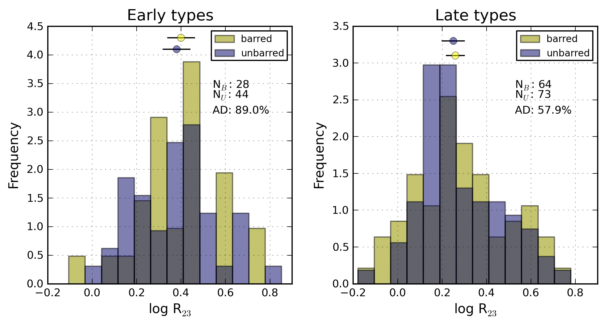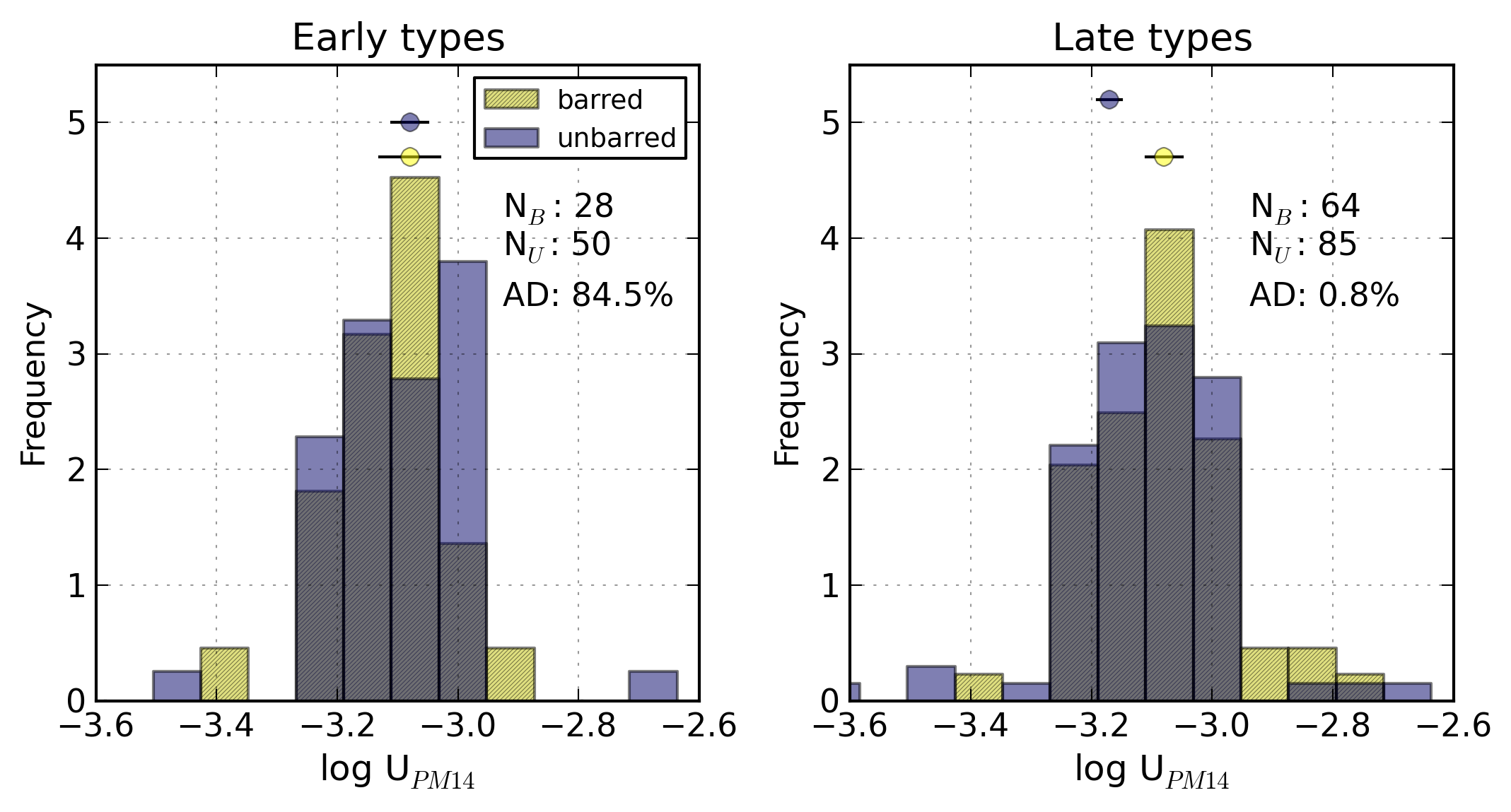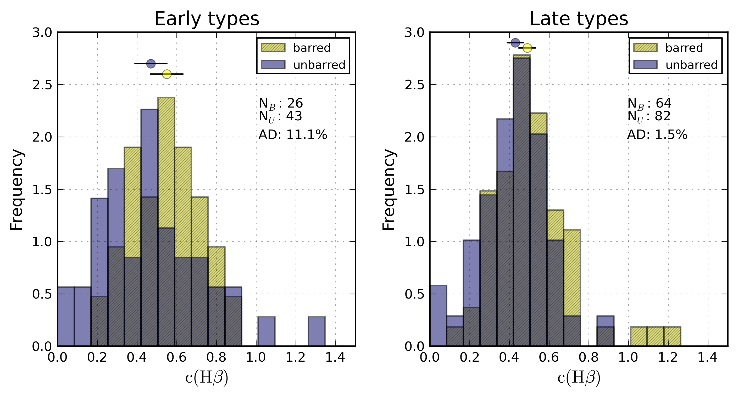 Comparative histograms of (from top to bottom and from left to right): the Balmer extinction at the Hβ emission line, c(Hβ), N2, log R23, decimal logarithm of the SFR per unit area, [S ii]λ6717/[S ii]λ6731 line ratio, logarithm of the ionisation parameter, N/O abundance ratio and oxygen abundance for barred (yellow, hatched) and unbarred (purple) galaxies separately for early- and late-type galaxies. The separation between early- and late-type galaxies was carried out using the B/D luminosity ratio as described in Sect. 9 for the non-AGN sub-sample of galaxies.