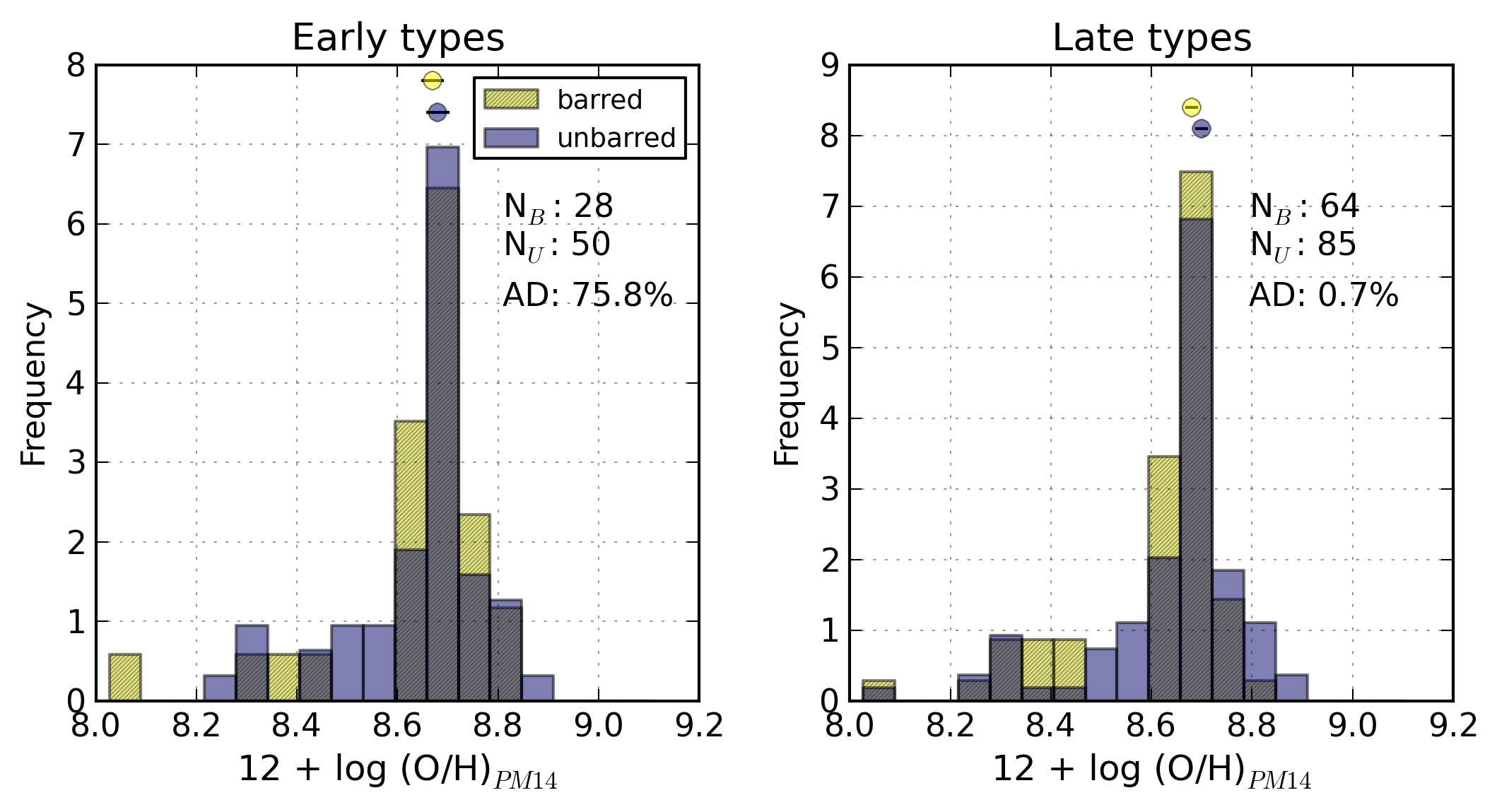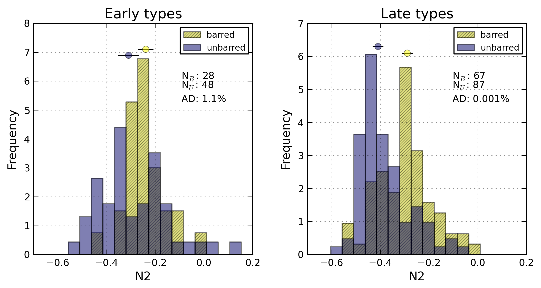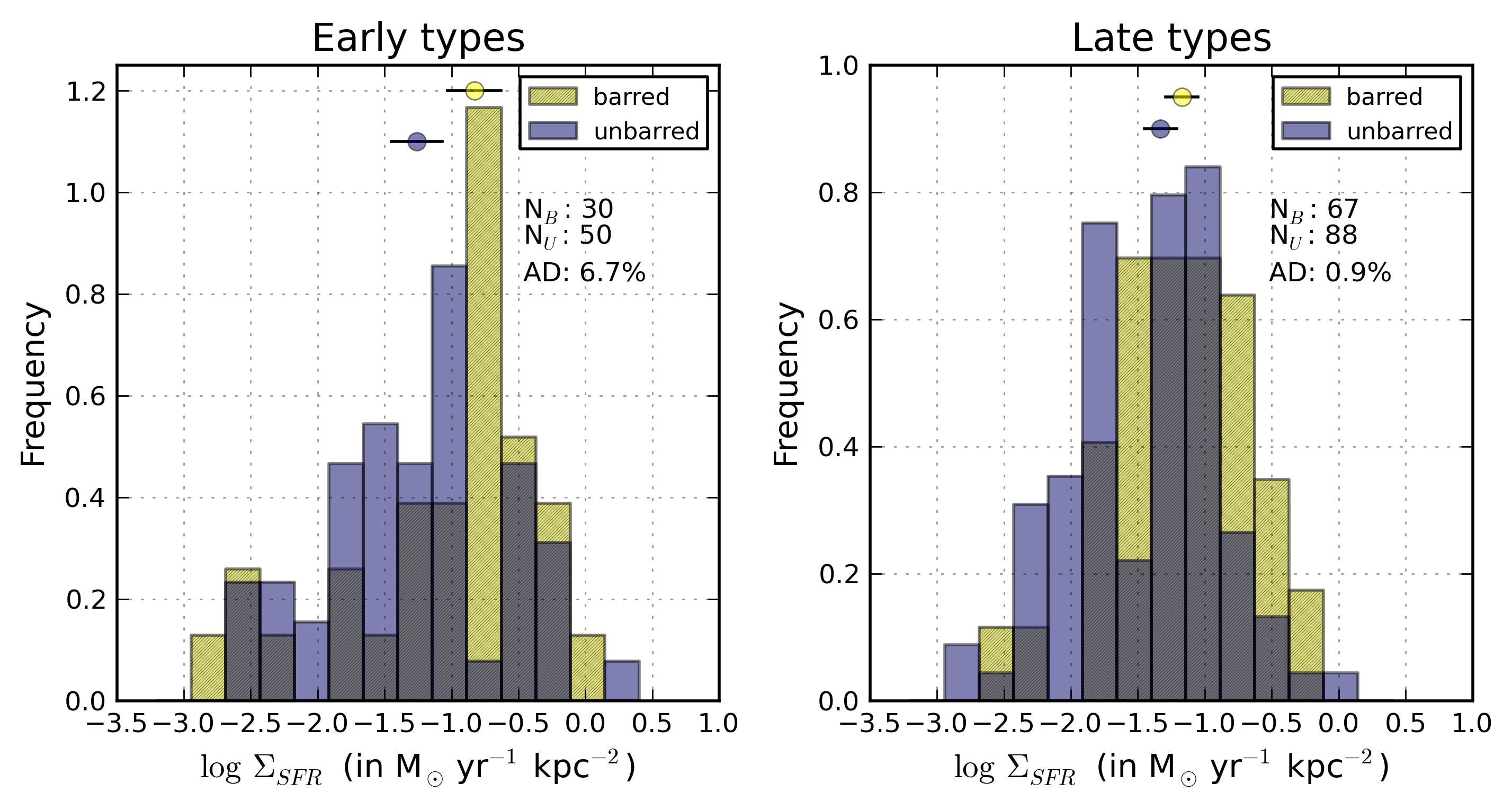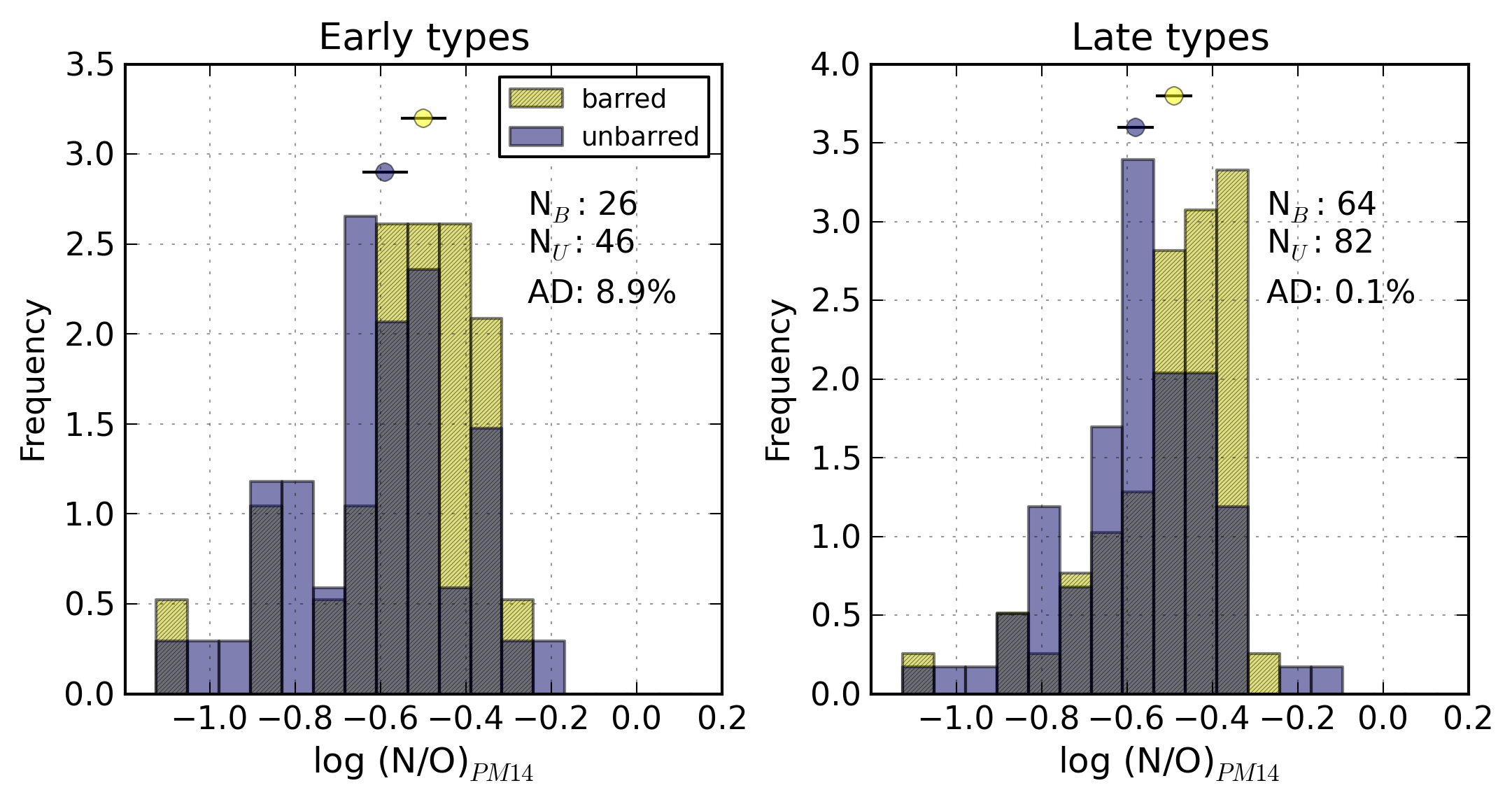 Comparative histograms of (from top to bottom and from left to right): the Balmer extinction at the Hβ emission line, c(Hβ), N2, log R23, decimal logarithm of the SFR per unit area, [S ii]λ6717/[S ii]λ6731 line ratio, logarithm of the ionisation parameter, N/O abundance ratio and oxygen abundance for barred (yellow, hatched) and unbarred (purple) galaxies separately for early- and late-type galaxies. The separation between early- and late-type galaxies was carried out using the B/D luminosity ratio as described in Sect. 9 for the non-AGN sub-sample of galaxies.
