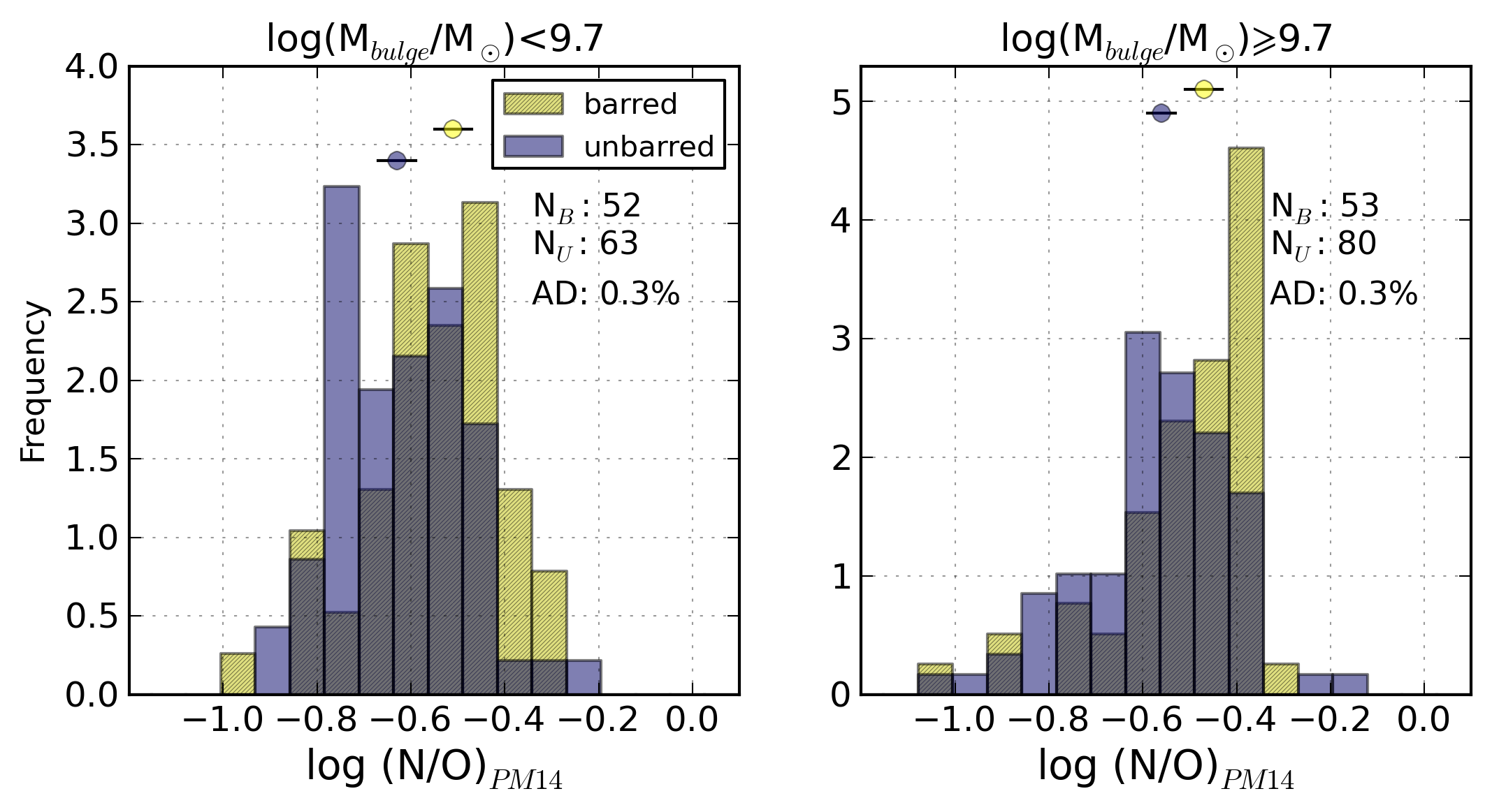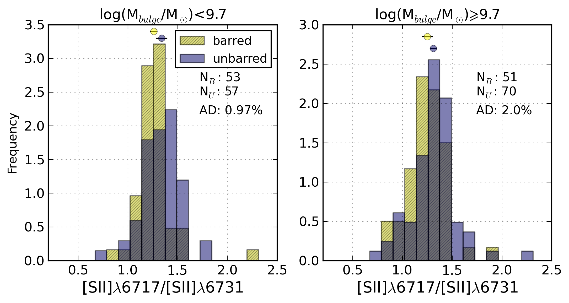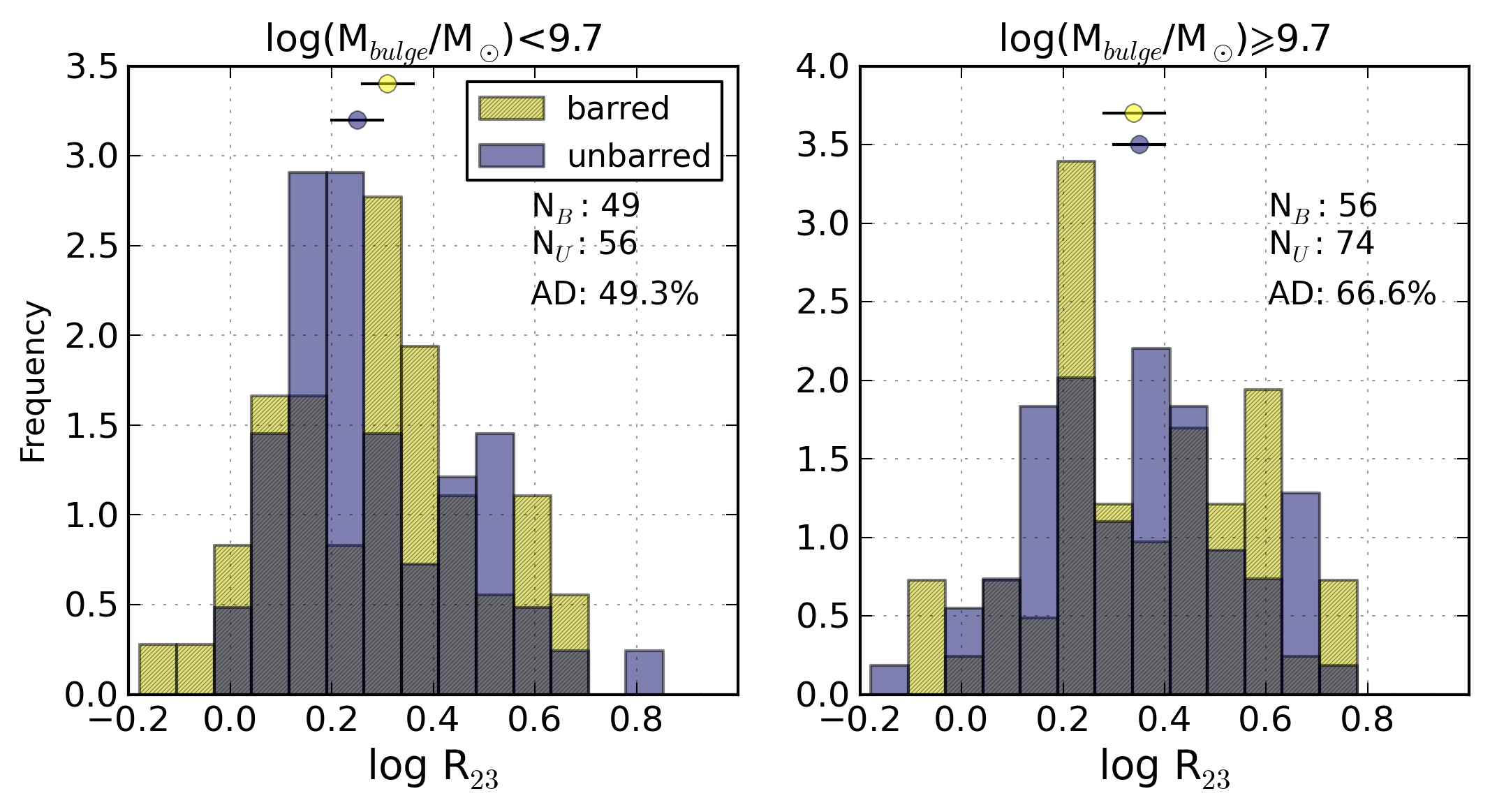 Comparative histograms of (from top to bottom and from left to right): the Balmer extinction at the Hβ emission line, c(Hβ), R23, N2, logarithm of the ionisation parameter, logarithm of the SFR per unit area, the [S ii]λ6717/[S ii]λ6731 line ratio, logarithm of the ionisation parameter, N/O abundance ratio, and oxygen abundance for barred (yellow, hatched) and unbarred (purple) galaxies separately for non-AGN galaxies with bulge mass lower than 109.7 M⊙ and for galaxies with heavier bulges (≳109.7 M⊙).