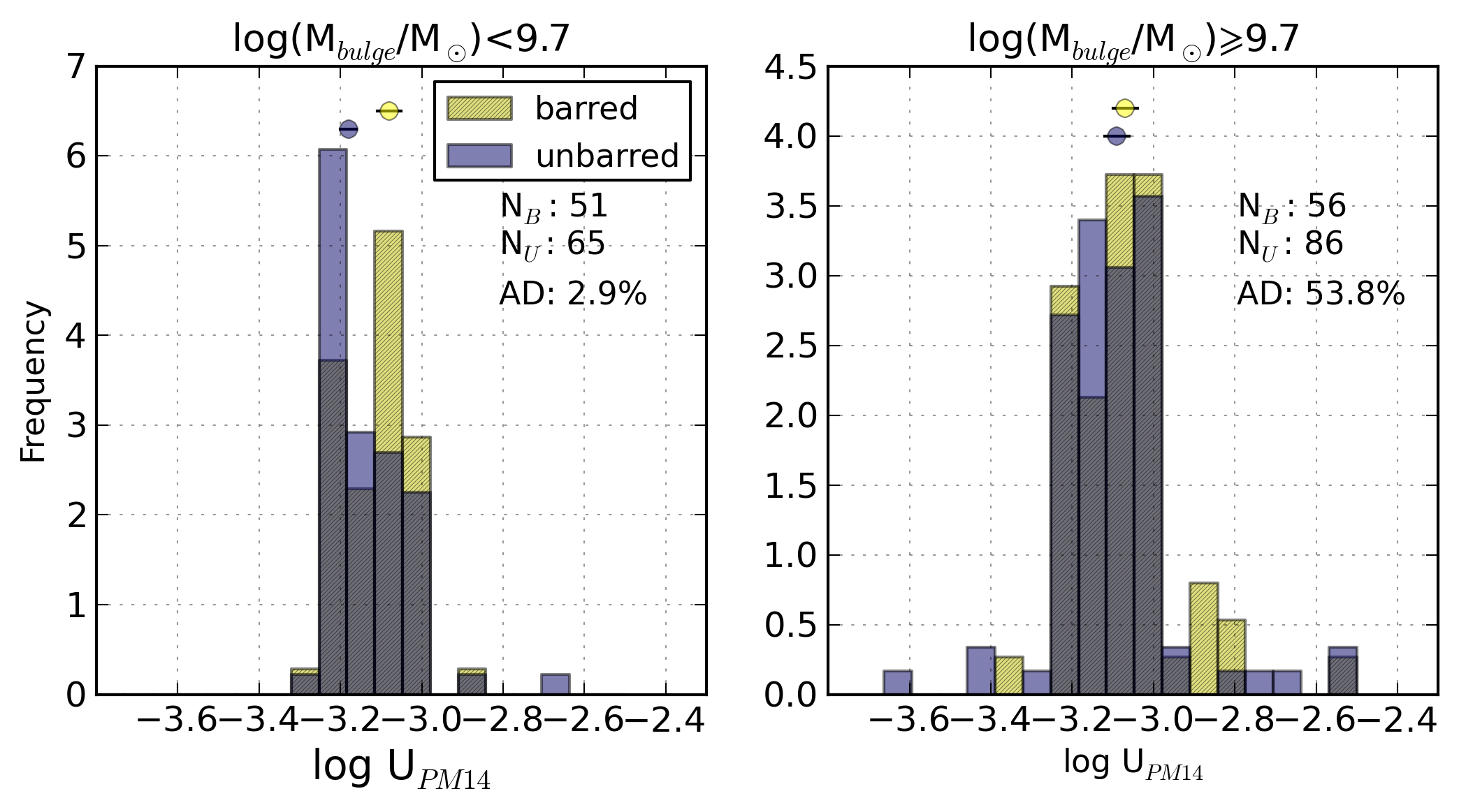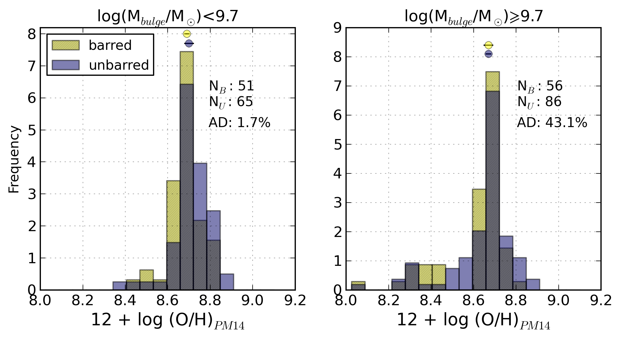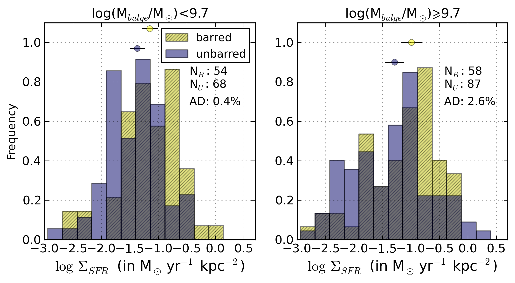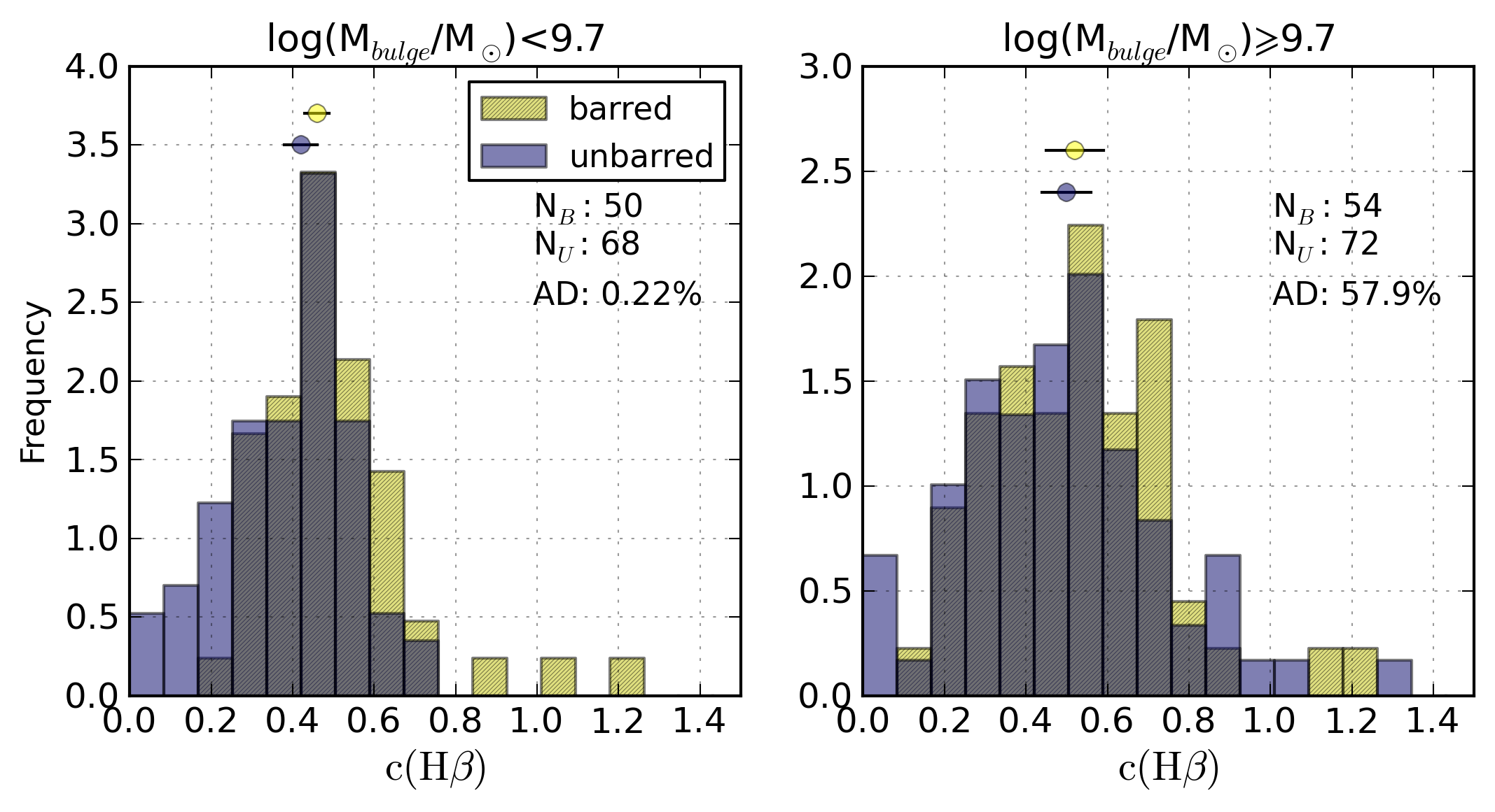 Comparative histograms of (from top to bottom and from left to right): the Balmer extinction at the Hβ emission line, c(Hβ), R23, N2, logarithm of the ionisation parameter, logarithm of the SFR per unit area, the [S ii]λ6717/[S ii]λ6731 line ratio, logarithm of the ionisation parameter, N/O abundance ratio, and oxygen abundance for barred (yellow, hatched) and unbarred (purple) galaxies separately for non-AGN galaxies with bulge mass lower than 109.7 M⊙ and for galaxies with heavier bulges (≳109.7 M⊙).