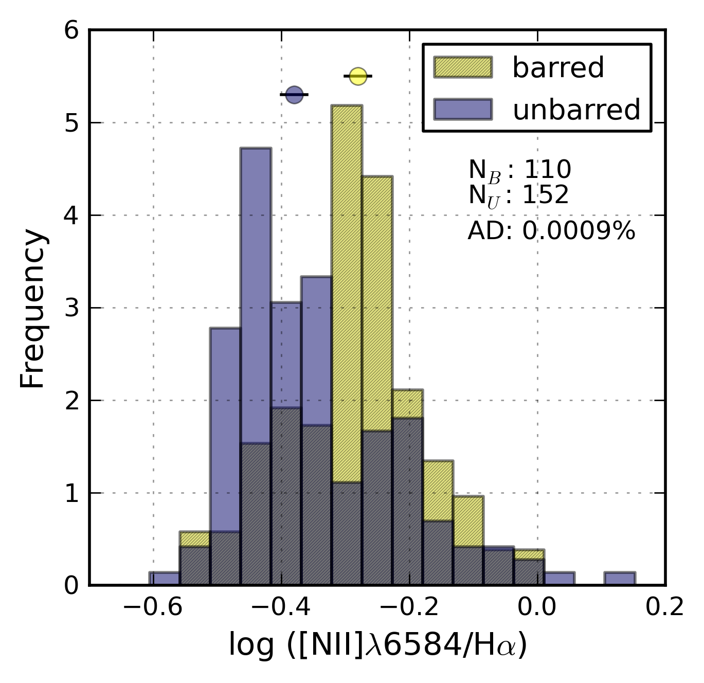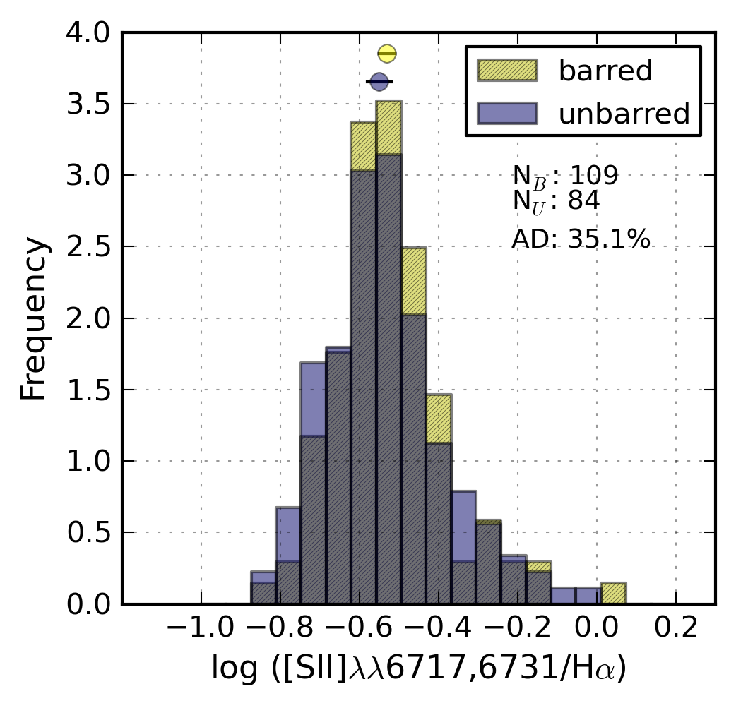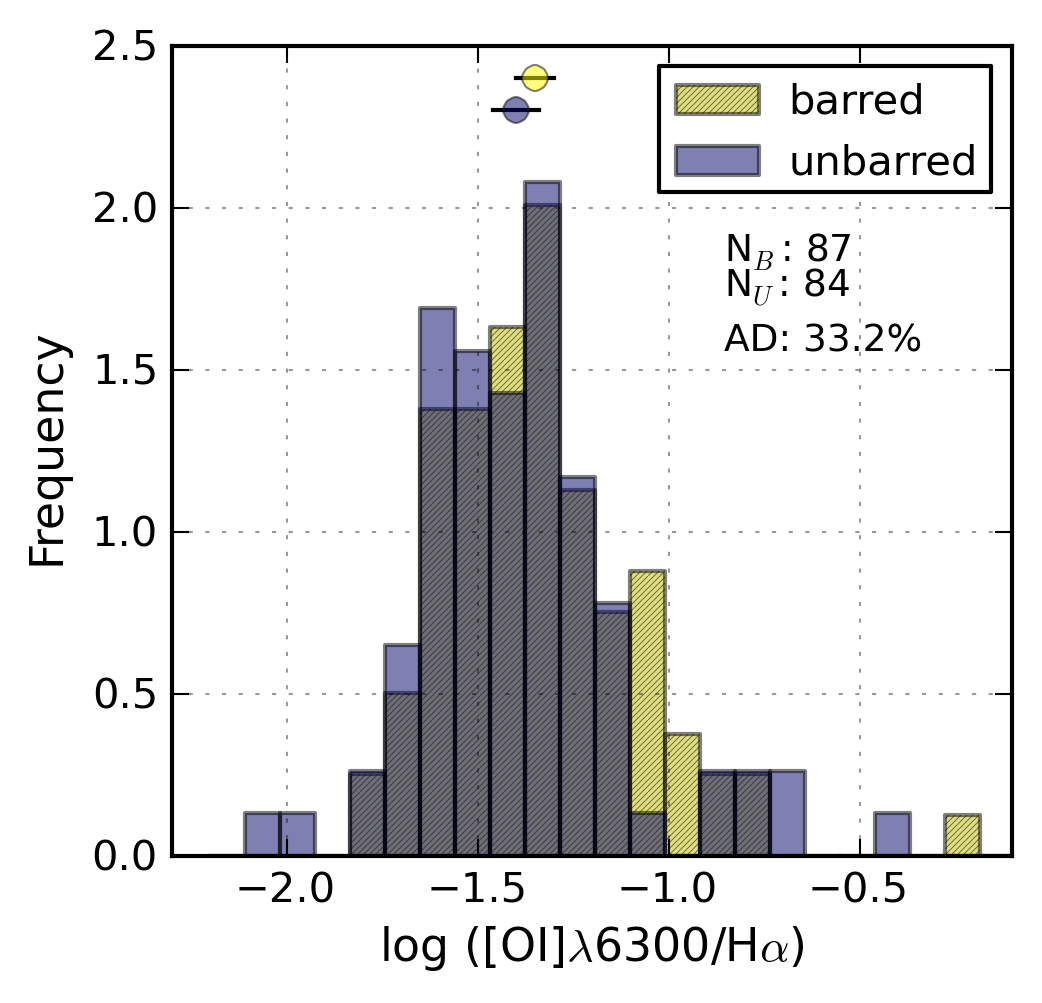 Histograms showing the distribution of AGN and shock-sensitive emission-line ratios (from left to right: [N ii]λ6583/Hα, [S ii]λλ6717, 6731/Hα, and [O i]λ6300/Hα) for barred and unbarred galaxies separately. All galaxies classified as non-AGN are included (see Sect. 4). The barred/unbarred distributions are only different for [N ii]λ6583/Hα, and therefore the source of the differences in that line ratio must originate from something other than shock ionisation and/or AGN contamination alone.
