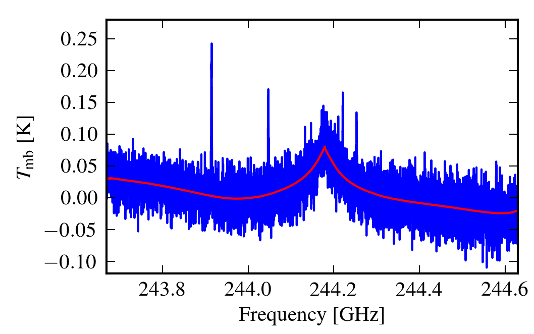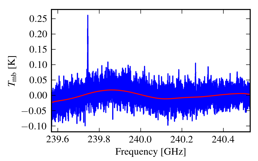 Examples of spectral data before they were treated by the running-mean baseline-fitting routine (blue) and the fitted baseline that was subsequently subtracted (red). The right spectrum has a discontinuity in the fitted baseline that is due to an atmospheric line.