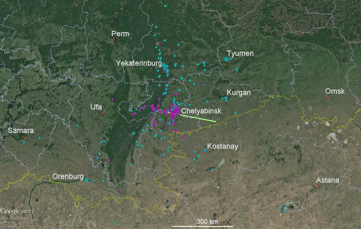 Map showing the positions of 715 geolocated videos. Upper panel: overview of the whole area where the superbolide was seen; lower panel: region near the end of the bolide, including the city of Chelyabinsk. The green line is the ground projection of the bolide trajectory, including individual fragments (Borovička et al. 2013). The green star is the landing point of the largest fragment (Popova et al. 2013). The cyan dots are locations of videos showing the bolide (Table A.1). Other videos are coded as follows: orange – videos with bolide light (Table A.2), magenta – videos with trail (Table A.3), red – videos showing damage and other consequences (Table A.4). The source of the background map is Google Earth.