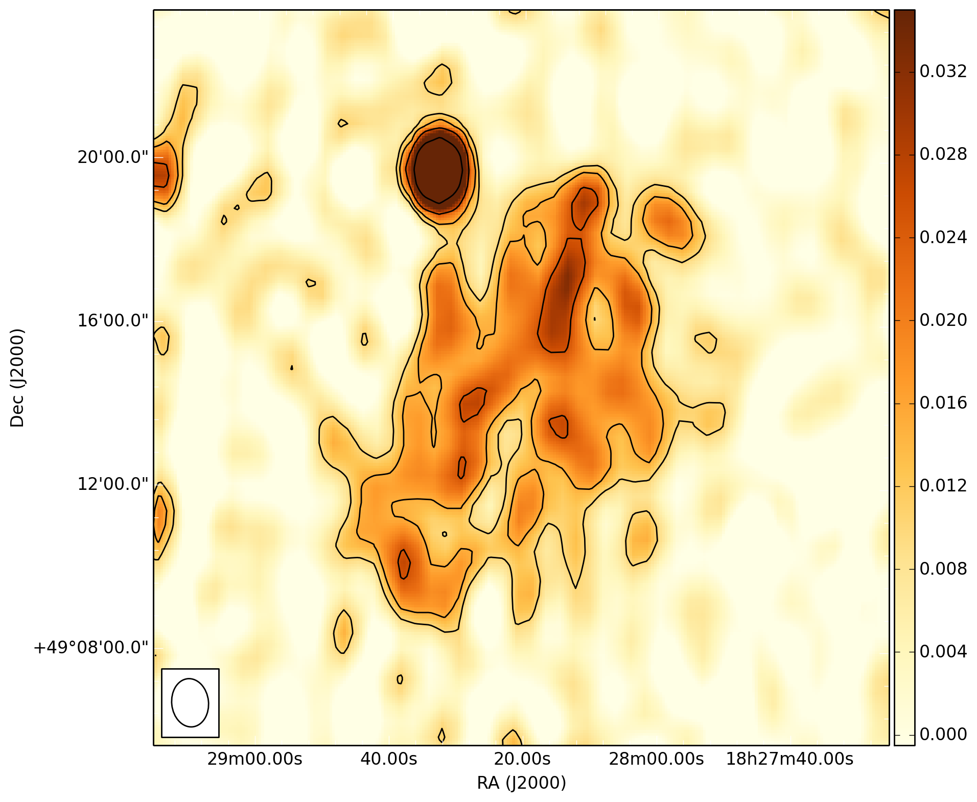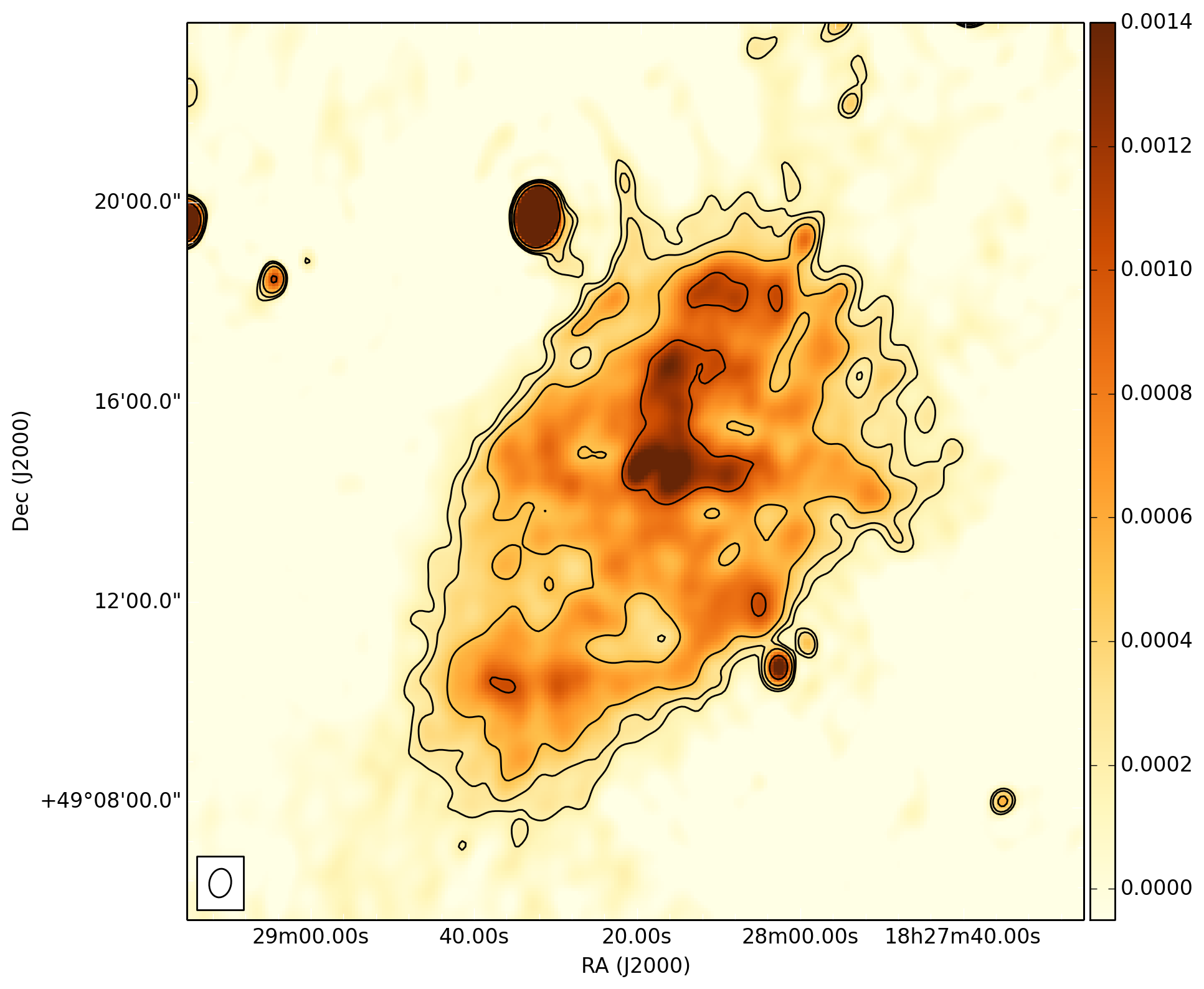 Radio maps of blob1: (top panel) LOFAR 137-MHz map, levels 2, 3, 5, 10 × σ (3.5 mJy beam-1); (middle panel) WENSS 327-MHz map, levels 2, 3, 5, 10 × σ (5 mJy beam-1); (bottom panel) WSRT 1400-MHz map, levels: 2, 3, 5, 10 × σ (0.08 mJy beam-1).