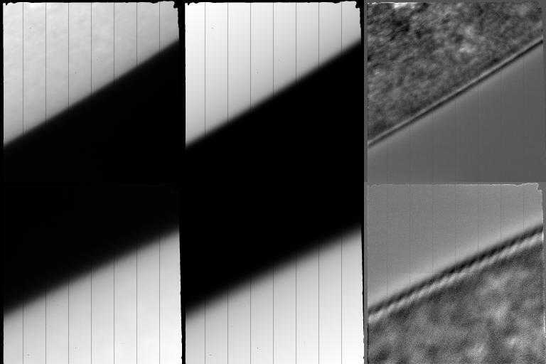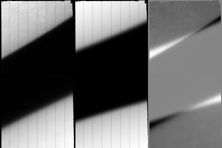 Limb fit for the 630 nm HA scan. Within each subfigure, the top and bottom tiles represent the masked 1024 × 1024-pixel images of the two limbs, respectively. In b) and c), the rightmost tiles represent the differences between the model images and the observed images.
