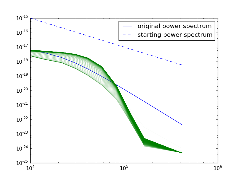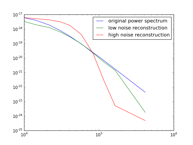 First panel: power spectrum reconstruction for the simulated low-noise and high-noise observations of Sect. 3.1. Second panel: evolution of the high-noise power spectrum reconstruction over 80 iterations. The iteration process is indicated from transparent to full green.