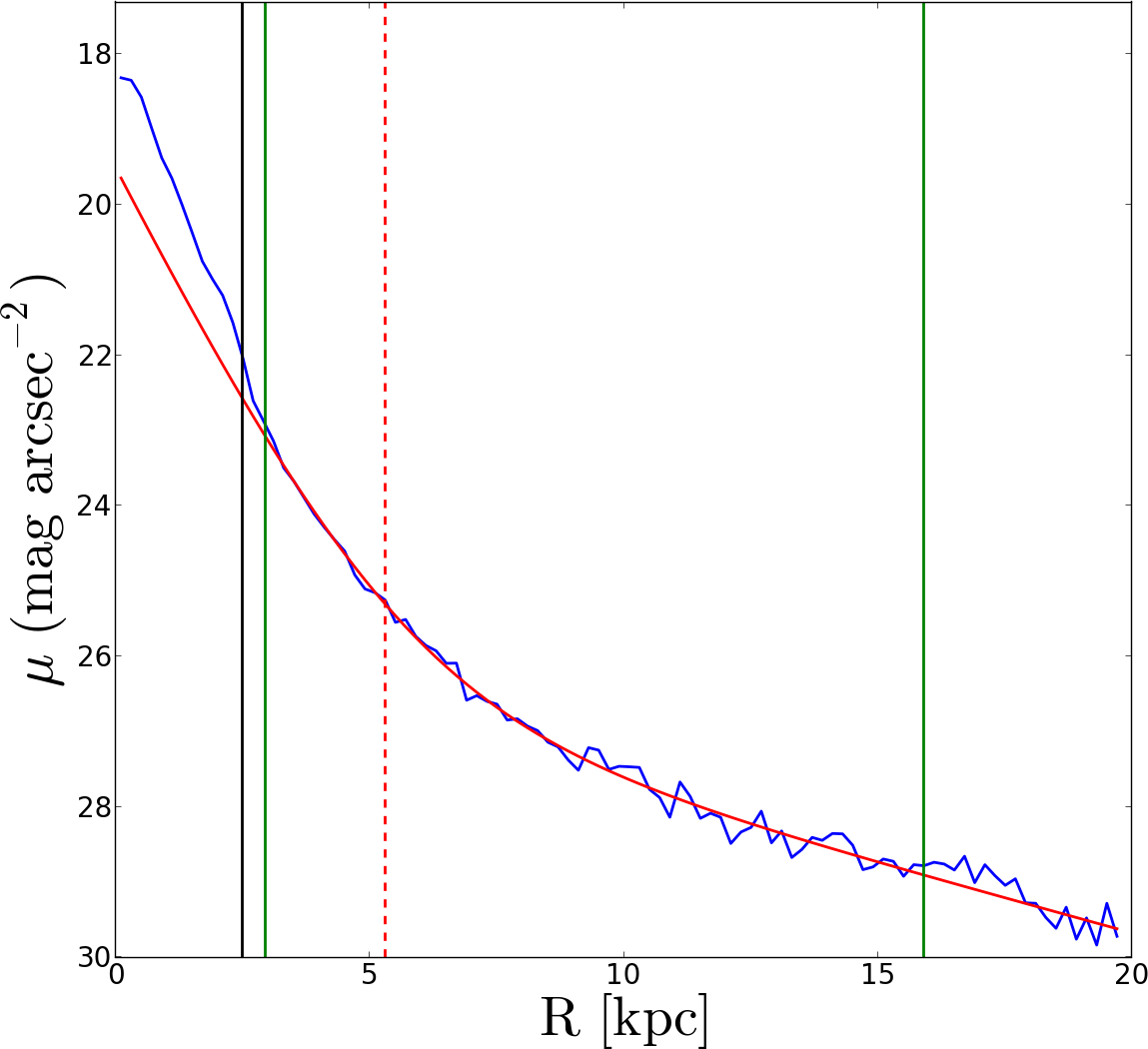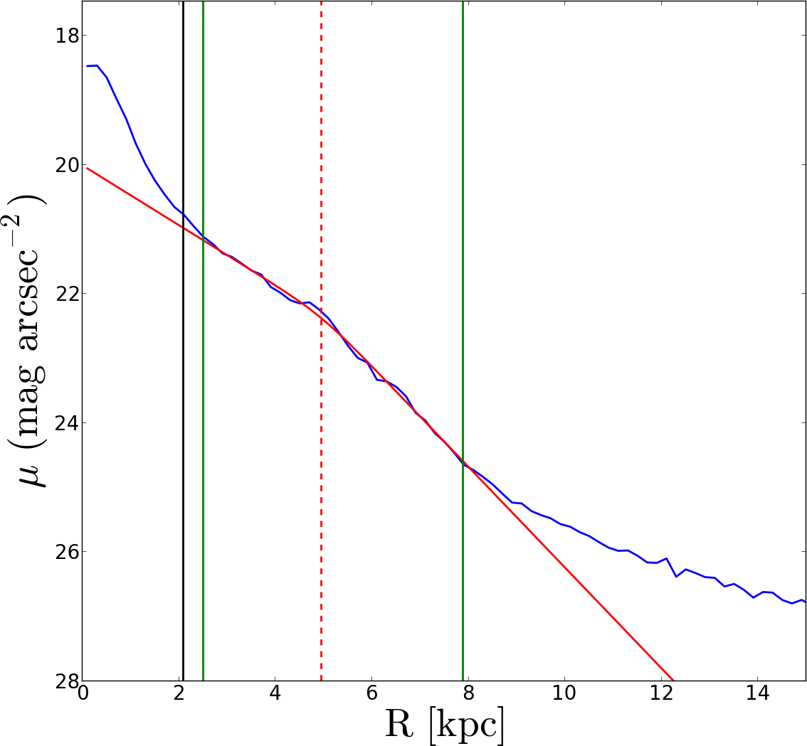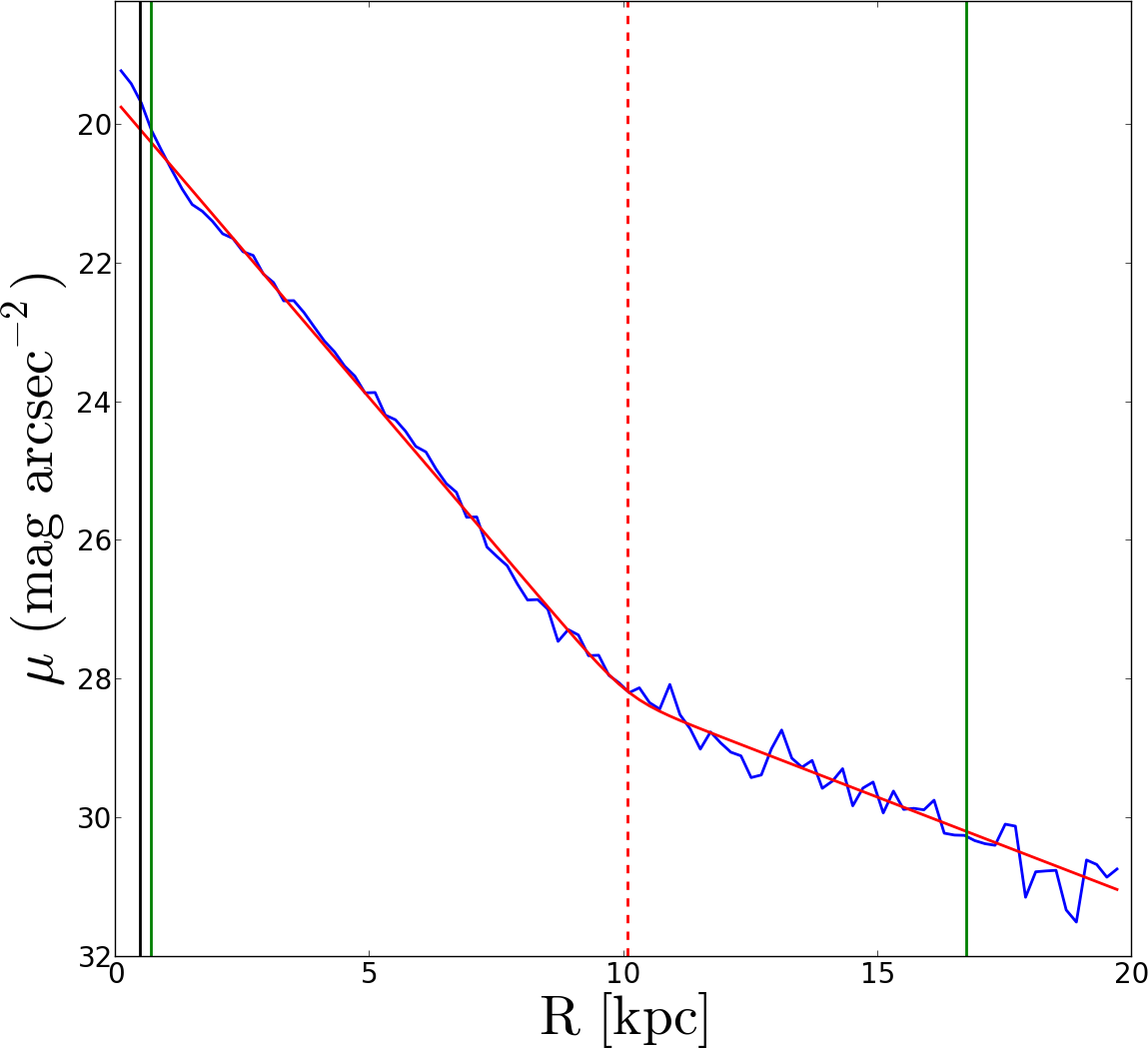 Surface brightness profiles in SDSS r band for Apollo (top left), Artemis (top right), Atlas (middle left), Ben (middle right), Castor (bottom left), and Daphne (bottom right). Blue solid line: “observed” SB profile using the SUNRISE (Jonsson 2006) mock images; those images can be seen in Few et al. (2012). Red solid line: single/double disc fit. Green, vertical, solid lines: these lines delimit the extent where the fit has been performed. Black vertical solid line: Boundary between the spheroid component and the disc; it is computed as the point where the distance between red and blue solid lines is less than 0.1 mag arcsec-1. Red, vertical, dashed line: location of the break.