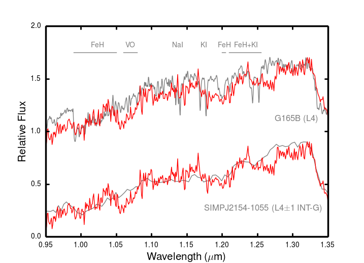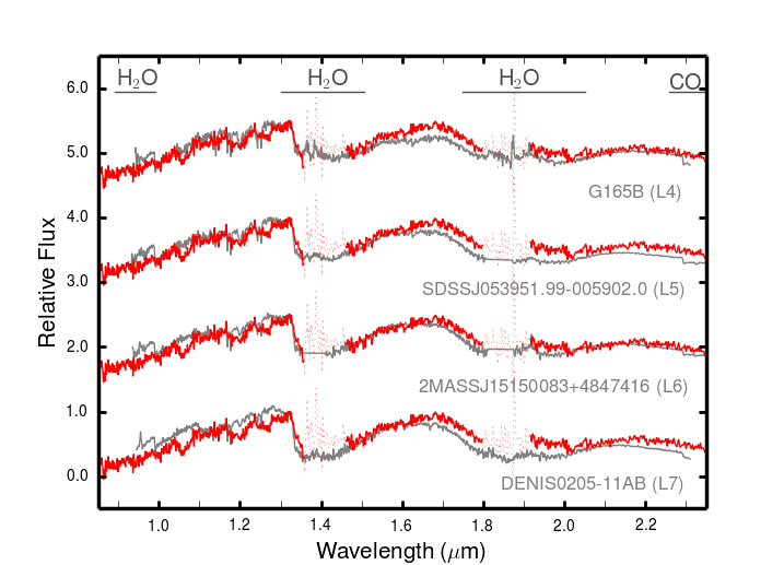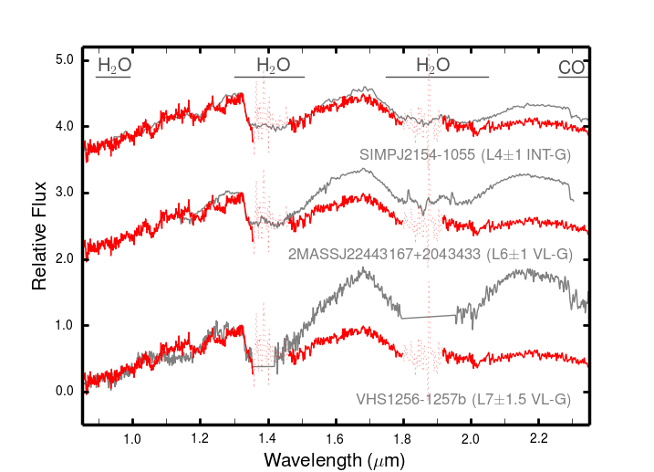 FIRE low-resolution near-infrared spectrum of J1551−2134 (solid red line) compared with field high-gravity dwarf templates (top panel) and with young low- (VL–G) and intermediate-gravity (INT-G) L dwarfs (middle panel). The comparison spectra are labelled and plotted with solid gray lines (see text for proper references to the data). Red dotted lines depict the wavelength regions strongly affected by telluric absorption. The bottom panel illustrates the enlargement of J1551−2134’s FIRE spectrum at around the K i lines (J-band). All spectra are normalized to unity at 1.32 μm and are shifted by a constant in the vertical direction. Some molecular and atomic features are identified.