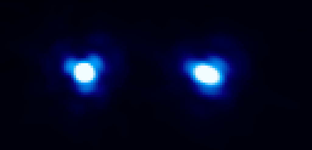 Combined Callisto and Ganymede measurement with the PACS photometer at 70 μm. The two sources were separated by about 55′′ and moved with different apparent motions (see Table 5) at the time of the observations. Top: PACS observing frames centered on Callisto (right source). Bottom: centered on Ganymede (left source). The angular separation is about 6′ between Jupiter and Callisto and about 5′ between Jupiter and Ganymede, with an apparent angular diameter of Jupiter of 40.7′′.