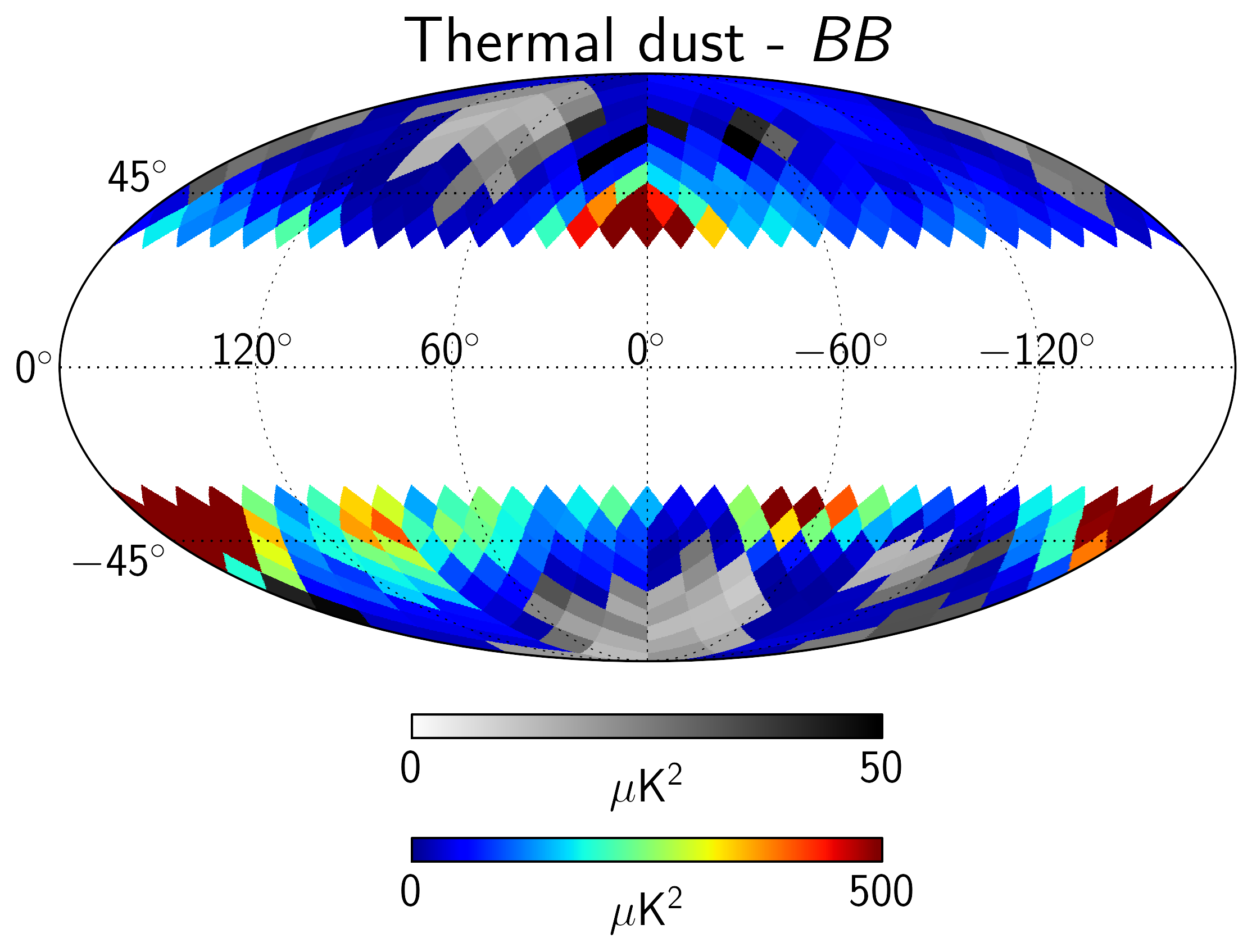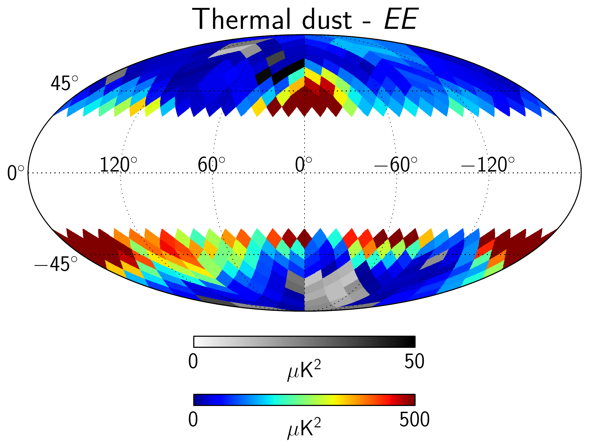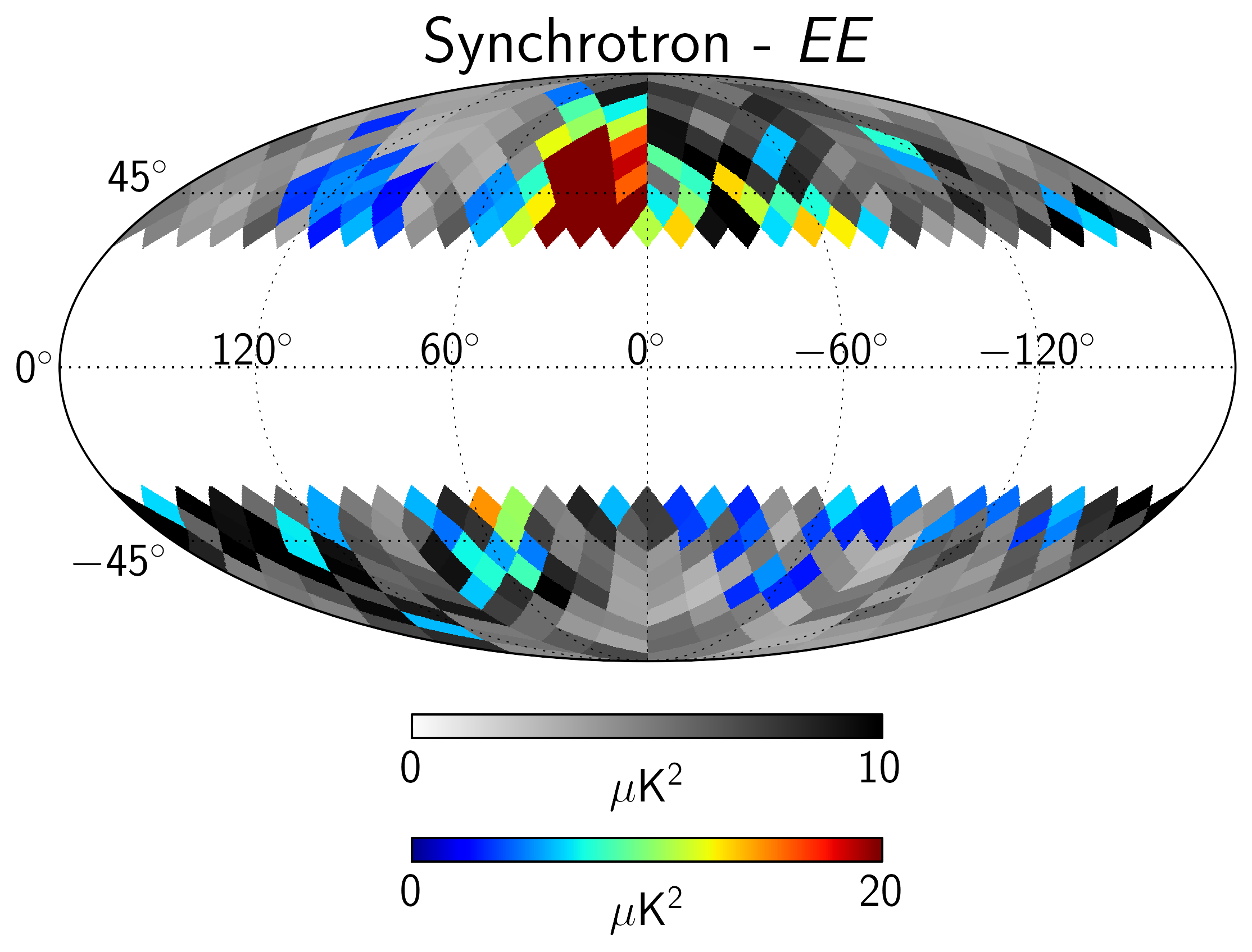 E (top) and B modes (bottom) power spectra measurements in the ℓ80 multipole bin for dust in the Planck 353 GHz channel (left) and synchrotron (right) via cross-correlation of the LFI 30 GHz and WMAP-K-band. Colored pixels report detection above 3σ. Gray pixels show upper limits where no detection was possible above the threshold, as defined in Eq. (2).