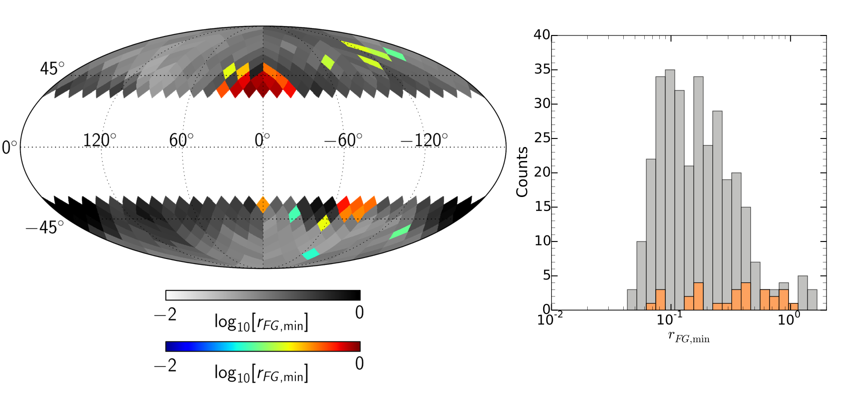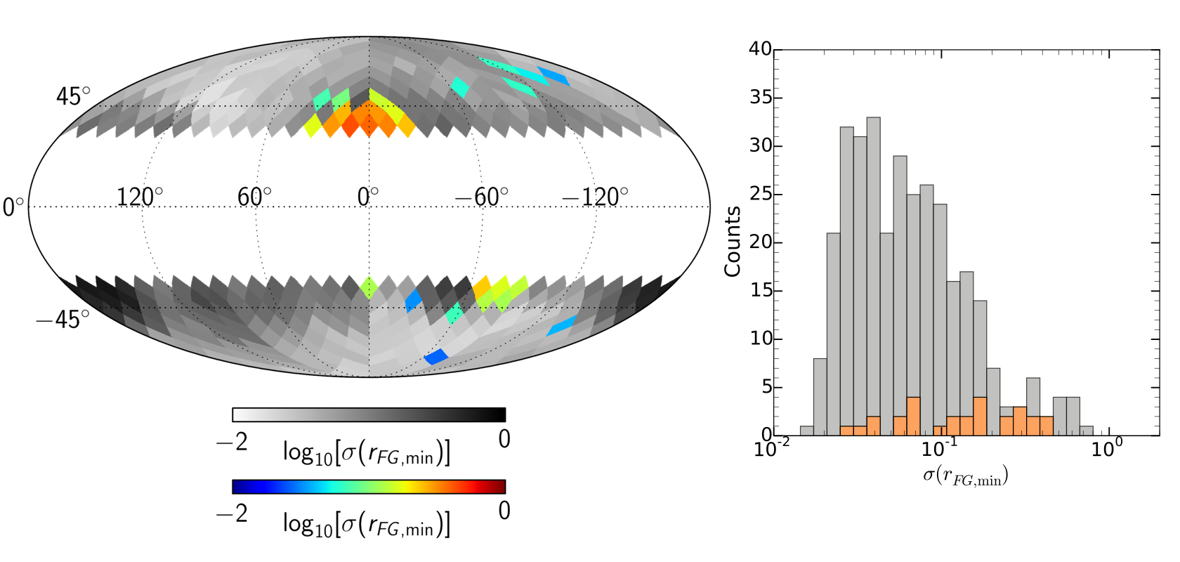 Minimum estimated foreground emissions (rFG,min) in units of the cosmological tensor-to-scalar ratio (top) and uncertainties on it (bottom). In maps, colored pixels refer to detection, gray pixels to upper limits. Histograms are obtained from the retrieved values reported on maps, orange bars for detection, gray bars for upper limits.