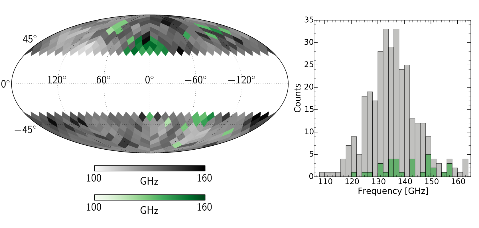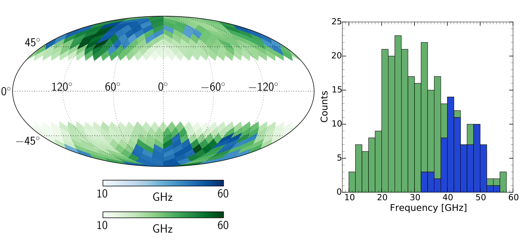 Frequency at which synchrotron and thermal dust contamination to CMB B modes drops below r = 0.005 (top and bottom panels, respectively). Green pixels for detections, gray pixels for upper limits, blue pixels for lower limits.