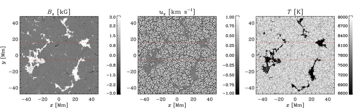 and oversaturate the scale so that structures in the deeper layers become visible. The line plots on the last two rows show the vertical magnetic field and equipartition field strength, and temperature at z = 0.6 Mm from the same y-positions. The red lines indicate low-pass filtered data where the filtering scale is dsm = 6.0 Mm. The positions of the cuts are indicated as red dotted lines in the uppermost row. Animation associated with this run can be found online and at http://research.ics.aalto.fi/cmdaa/group-Movies.shtml